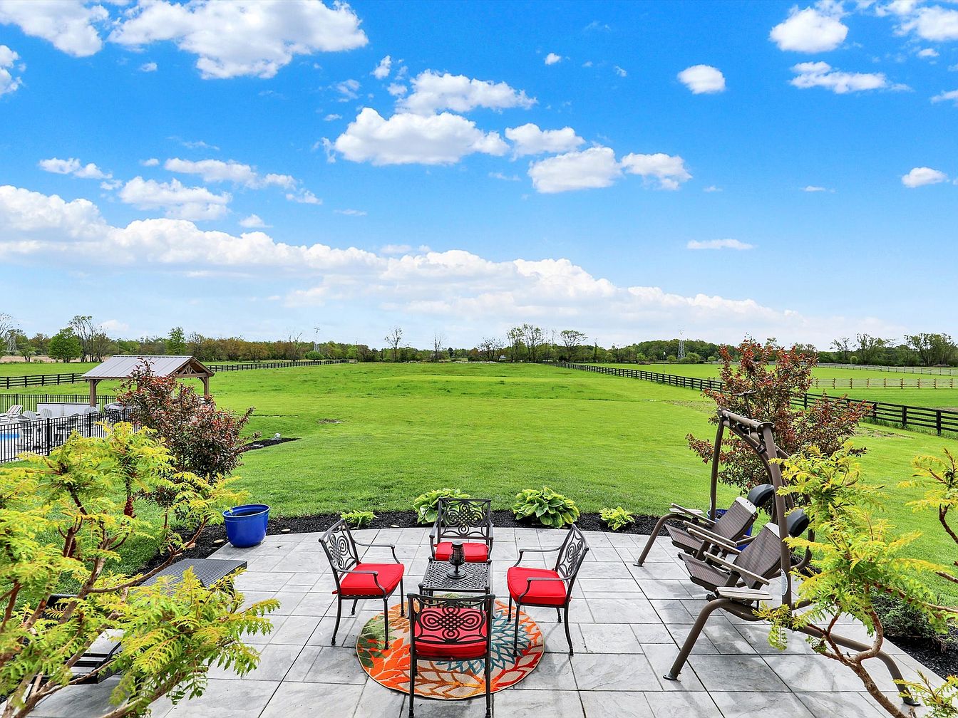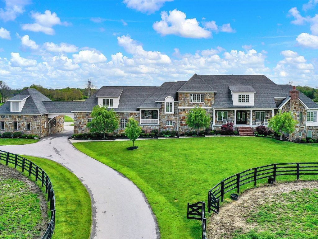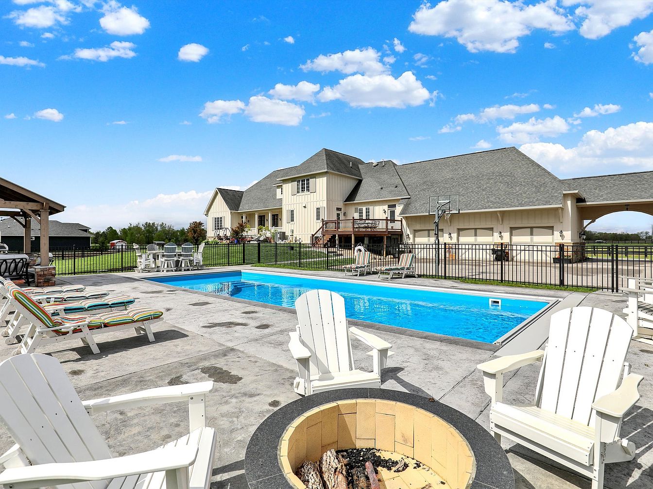 This exceptional custom estate in Zionsville, Indiana, presents a masterful blend of luxury, comfort, and equestrian living set on 8.47 private, pastoral acres. Featuring over 10,000 square feet of refined living space, the home showcases timeless architectural design with high-end finishes and functional layout. The stone facade exterior complements the estate’s private and elegant presence. Inside, the heart of the home is a spacious 22×20 eat-in kitchen equipped with custom cabinetry, honed marble countertops, a Viking gas range, and four SubZero fridge/freezer units cleverly concealed behind an armoire. Additional kitchen features include a walk-in pantry and a planning center for optimal organization. The adjacent family room measures 22×18, offering a warm and inviting gathering space. The main level includes a luxurious primary suite with cathedral ceilings, solid walnut floors, and private access to an office and balcony. Its ensuite bathroom boasts a Whirlpool tub, marble walk-in shower, dual quartz vanities, and custom his-and-her closets. Interior highlights further include soaring 10+ foot ceilings, a striking 22×13 library with an antique fireplace, and a formal living and dining room accented by beveled glass doors and a travertine fireplace. Upstairs features three generously sized bedrooms each measuring over 19×15 with cathedral ceilings, a Jack and Jill bath, a large bonus room, and a second laundry room for added convenience. The finished walk-out lower level is designed for recreation and relaxation, with amenities such as a theater, game room, wet bar, exercise room, fifth bedroom, and steam-ready bathroom. The equestrian facilities include a custom stone facade barn with three stalls and room for five, a tack room, wash rack, and a nearby half bath. Outdoor living is embraced with a fiberglass in-ground pool, covered outdoor kitchen, firepit, and hot tub. The fully fenced grounds include two pastures, a sand riding ring, and a substantial 1,189 square foot three-car garage. Professional landscaping and an irrigation system complete this grand estate’s outdoor features. The listing price for this unparalleled residence is $2,350,000, offering a rare opportunity to own a luxurious and functional estate that perfectly balances elegant living with equestrian amenities.