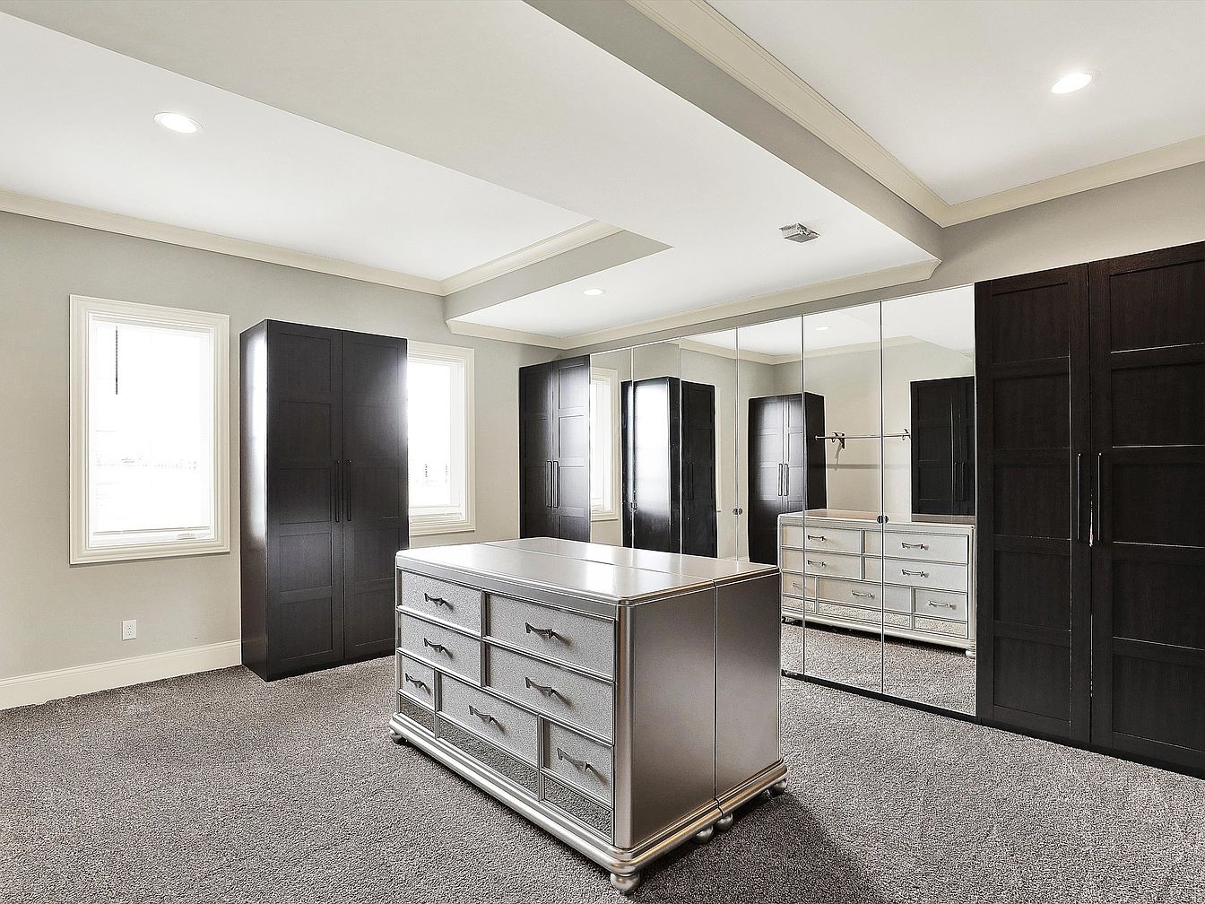 This spacious walk-in closet is characterized by a neutral palette of soft gray walls and plush charcoal carpeting, creating a calm and elegant atmosphere. The room features symmetrical dark wood wardrobes flanking each side, offering ample storage and a strong contrast against the light walls. A central silver-toned dresser with multiple drawers adds a touch of sophistication and practical storage workspace. The far wall is entirely mirrored, enhancing the visual depth and brightness of the space. Subtle recessed lighting in the tray ceiling ensures an even illumination, highlighting the room’s clean lines and modern, yet timeless design.