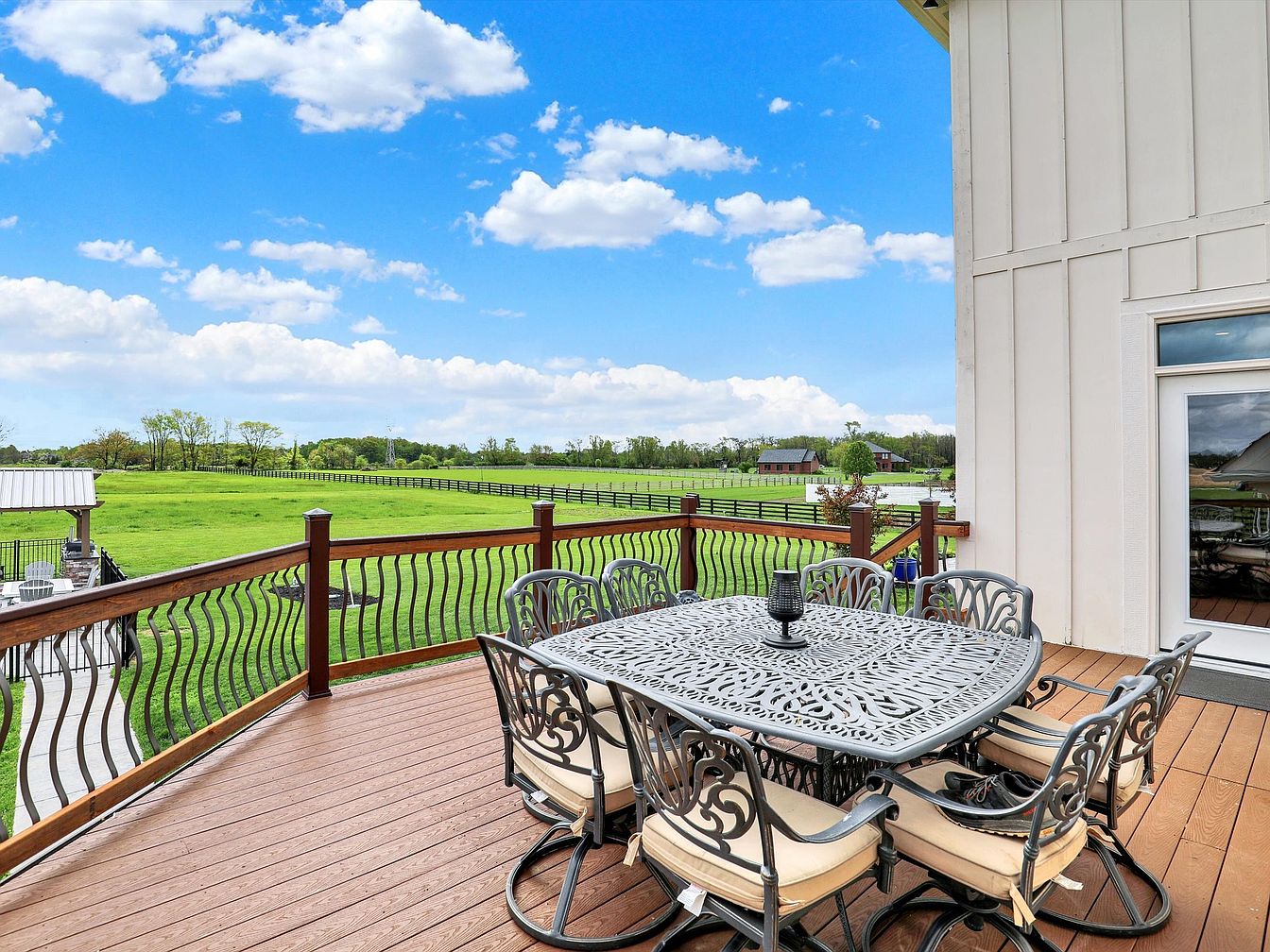 This spacious outdoor deck serves as a charming dining area, perfect for enjoying meals with a panoramic view of lush green fields and a bright blue sky dotted with fluffy clouds. The deck features warm-toned wooden flooring paired with a stylish wrought iron dining set of eight chairs, finished in black with intricate scrollwork designs and cushioned seats in a neutral beige. A sleek black candle holder sits at the center of the table, enhancing the inviting ambiance. Curved black metal balusters with wooden handrails frame the deck, complementing the soft off-white siding of the house and creating a seamless transition between indoor comfort and outdoor tranquility.