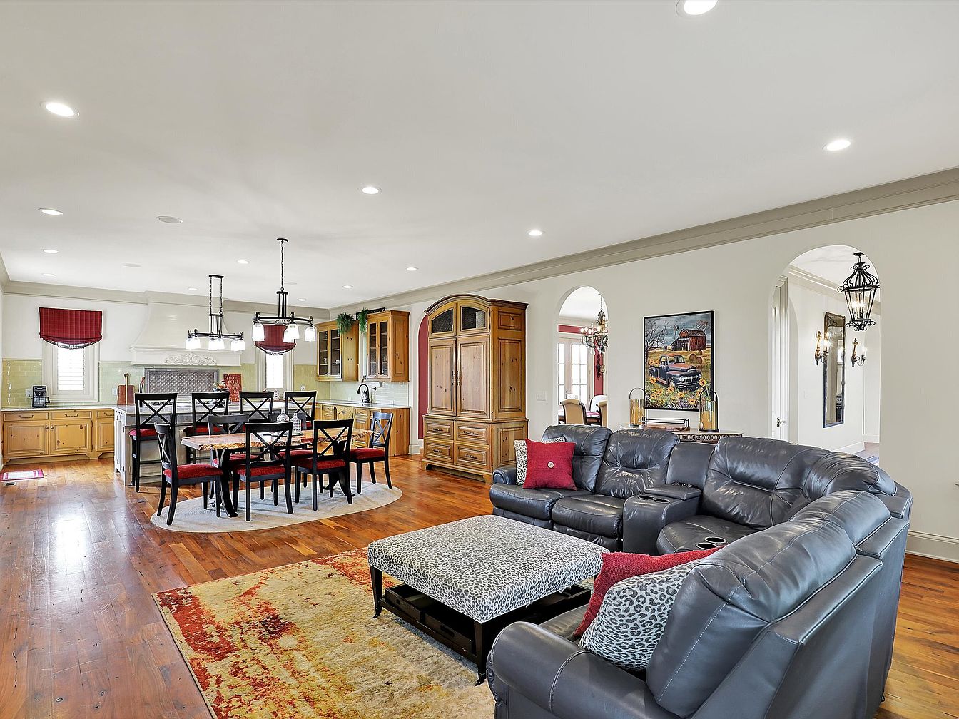 This inviting open floor plan seamlessly combines a cozy living area with a spacious kitchen and dining space. The living area features a large black leather sectional accented by red and animal print pillows, paired with a patterned ottoman that doubles as a coffee table. Warm wooden floors and a richly colored area rug add warmth and texture. The kitchen includes honey-toned wood cabinetry and a generous island with black cabinetry, surrounded by black dining chairs with red cushions. White walls and ceilings provide a neutral backdrop, enhanced by recessed lighting and classic arched doorways linking adjacent rooms, highlighting a balanced mix of rustic and contemporary styles.