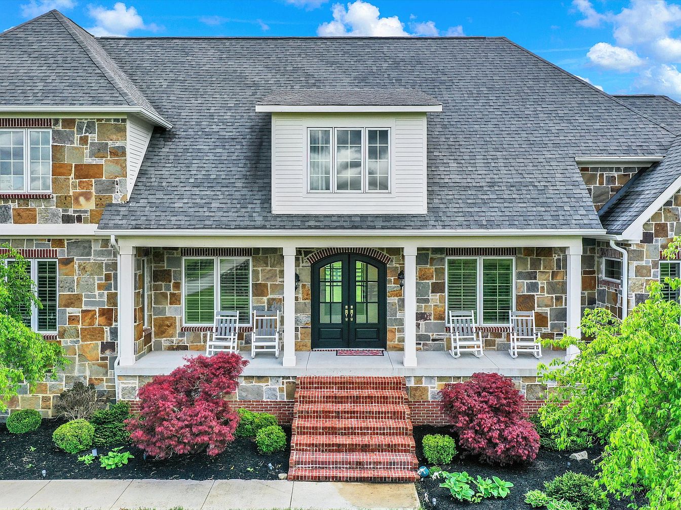 The spacious front porch creates a welcoming entry with its natural stone facade, blending warm earth tones of beige, brown, and gray. A set of wide brick steps leads up to the porch, flanked by manicured shrubs and vibrant red foliage that adds a pop of color against the dark mulch. Four white rocking chairs provide a cozy seating arrangement under the protective roof, supported by white columns that contrast beautifully with the darker stone. Above, a dormer window accentuates the gray shingled roof, adding architectural interest and balance to the home’s symmetrical design.