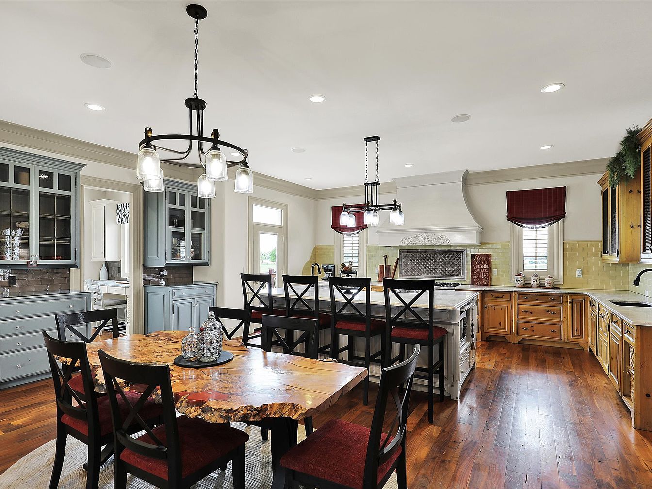 This open-concept kitchen and dining area features a warm, inviting atmosphere highlighted by rich wood flooring and a striking live-edge wooden dining table surrounded by six black chairs with red cushions. The kitchen blends natural wood lower cabinets with chic gray-blue upper cabinetry, accented by light yellow subway tile backsplash. A large central island with white cabinetry and a marble countertop provides ample workspace and seating with five dark wood stools. Pendant lights with glass shades and black fixtures hang over both the island and dining table, adding an industrial yet elegant touch. Crown molding and neutral wall paint complete the sophisticated, cohesive look.