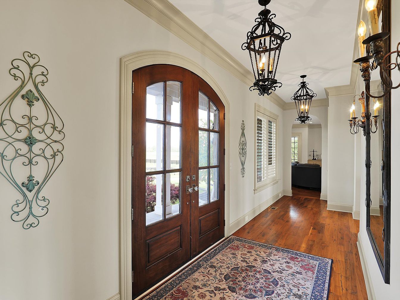 This inviting entryway features a grand double door with rich wood tones and multiple glass panes that let natural light in. The walls are painted in a soft, neutral hue, complemented by cream crown molding and trim. The warm hardwood floor adds to the cozy atmosphere, enhanced further by a traditional patterned area rug with intricate designs in muted reds, blues, and tans. Ornate black wrought-iron lantern-style pendant lights hang from the ceiling, echoed by matching wall sconces and decorative wrought-iron wall art. The space leads to an archway opening into a comfortable living area, creating an elegant yet welcoming transition.