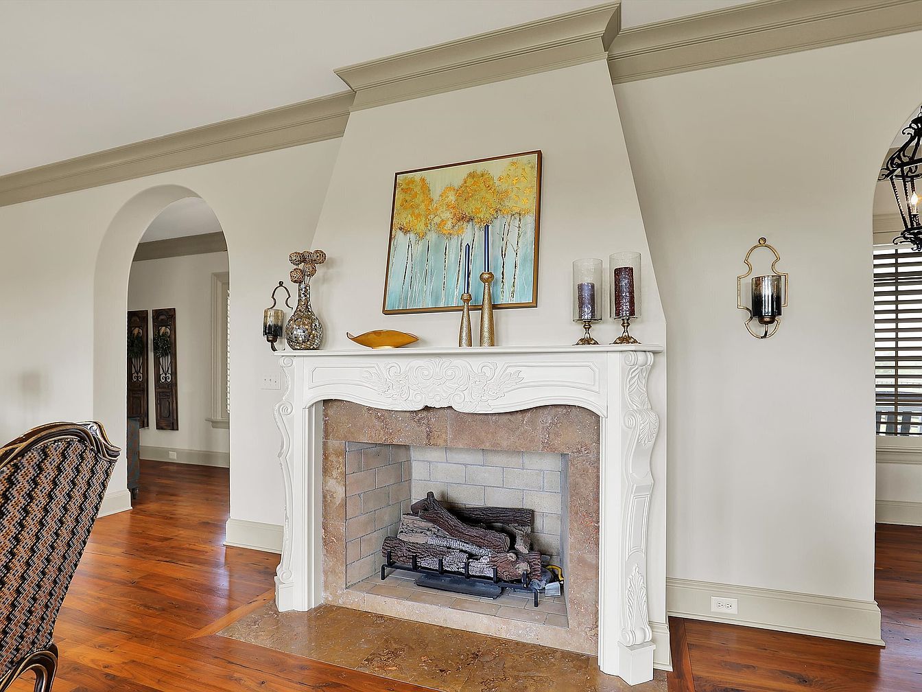 This elegant living room corner features a beautifully carved white mantel framing a stone fireplace, adding a classic touch to the space. The neutral walls complement the warm, rich hardwood flooring, unifying the room’s palette. Above the mantel, a vibrant painting of golden yellow trees against a soft blue background introduces a pop of color, while decorative candlesticks and a textured vase add subtle sophistication. Architectural details such as the graceful archways and crown molding enhance the room’s refined atmosphere. Together, these elements create a warm, inviting gathering spot with timeless appeal and attention to detail.