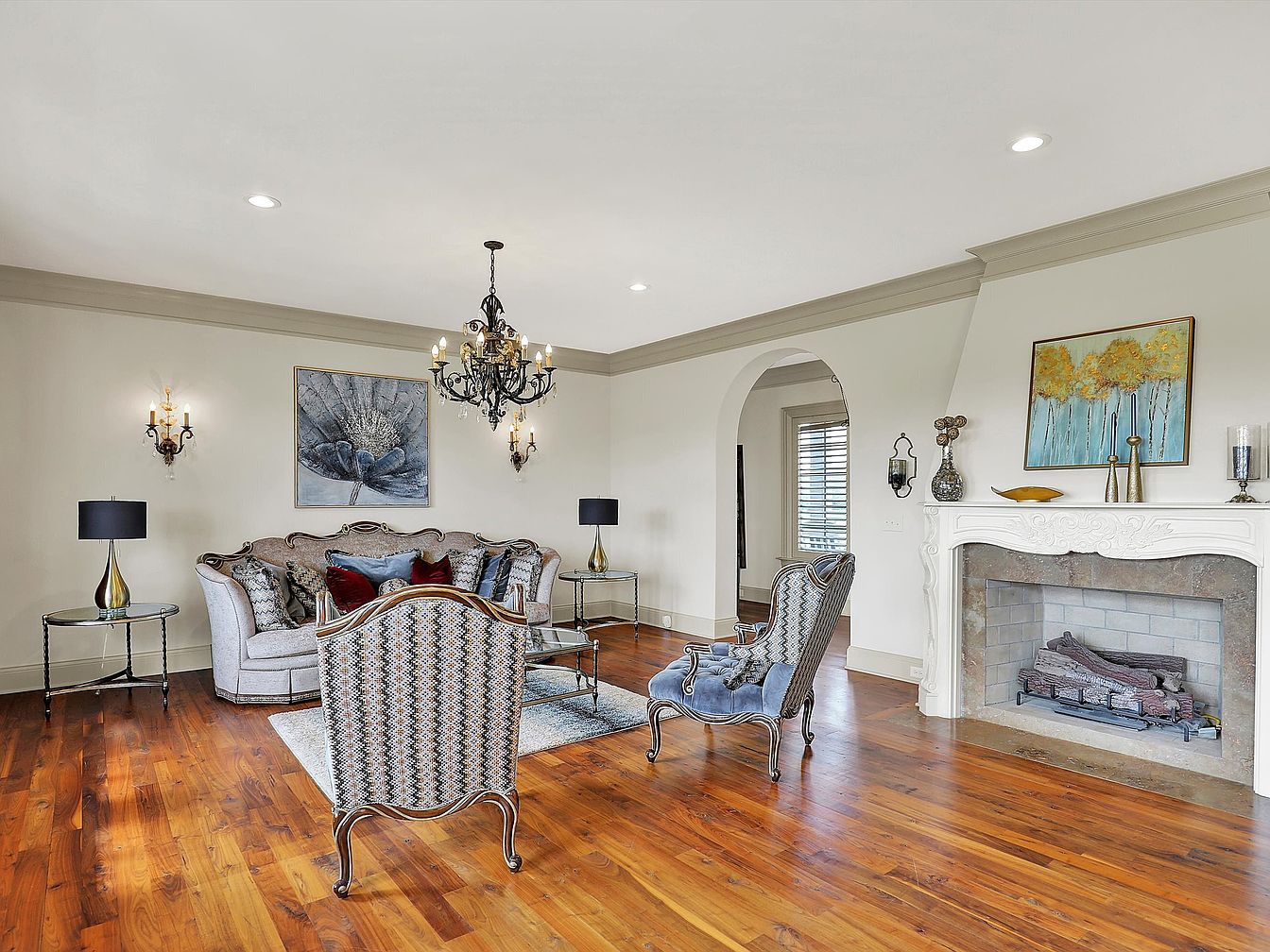 This elegant living room features rich hardwood flooring with a warm, natural finish, providing a cozy foundation. The walls are painted in a soft off-white with taupe crown molding that adds subtle contrast and sophistication. Centered here is a stately fireplace framed in detailed white molding, accented with contemporary artwork and decorative vases. Comfortable, classic-style seating with patterned upholstery and plush cushions surrounds a glass coffee table on a neutral area rug. A black wrought-iron chandelier and matching wall sconces illuminate the room with an inviting, vintage charm, complementing the overall refined aesthetic. An arched doorway adds architectural interest and flow to adjacent spaces.
