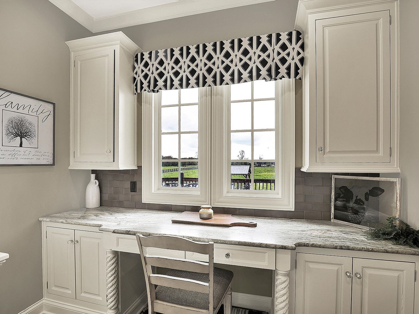 This cozy built-in nook is nestled between custom cabinetry, offering a practical and stylish workspace. A marble-effect countertop provides a smooth, elegant surface, perfectly paired with soft gray walls and coordinating subway tile backsplash. Above, a broad window floods the space with natural light while providing a picturesque view of the greenery outside. The window is accented with a black and white geometric valance adding a modern touch to the otherwise classic setting. A cushioned wooden chair and simple decor elements, like a white ceramic vase and framed art, evoke a calm and inviting atmosphere ideal for quiet tasks or reading.