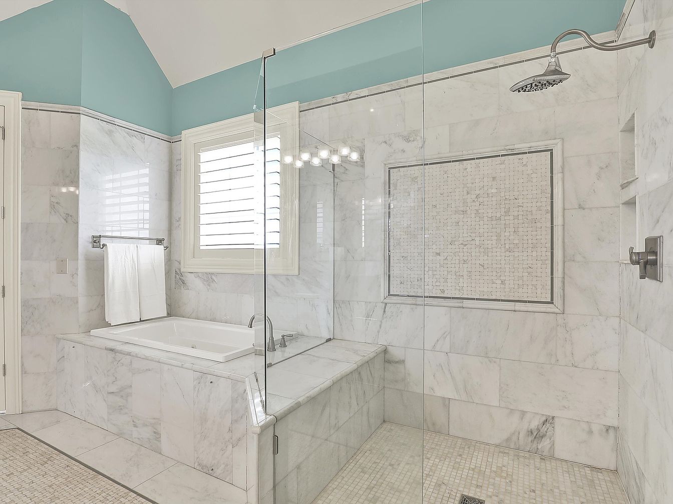 This elegant bathroom combines a spacious soaking tub with an adjacent walk-in shower enclosed by seamless glass. The space is accented with luxurious white and gray marble tiles covering the walls, floor, tub surround, and shower, offering a cohesive and high-end feel. A tiled accent panel within the shower adds visual interest, while the chrome fixtures, including a rainfall showerhead, provide modern touches. The upper walls are painted a calm, light turquoise, creating a serene contrast. A window with white plantation shutters brings privacy and natural light, enhancing the fresh and airy atmosphere.