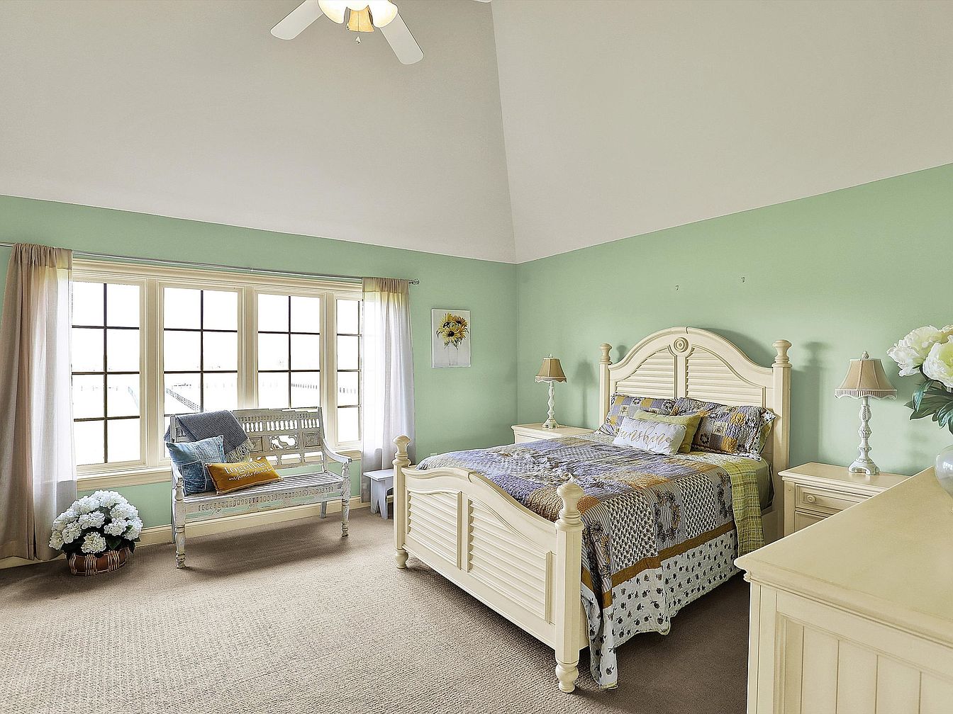 This master bedroom features a high vaulted ceiling accentuating spaciousness and light. The lower walls are painted a soothing mint green, contrasting gently with the soft white upper walls and trim, creating a calm atmosphere. The cream-colored wooden bed with a paneled headboard and footboard anchors the room, accompanied by matching nightstands and lamps. A patterned quilt with earthy tones adds warmth and texture, while sheer curtains allow natural light to brighten the space. An antique-style white bench near the window offers seating, decorated with cozy pillows. A large beige carpet covers the floor, enhancing comfort and warmth.