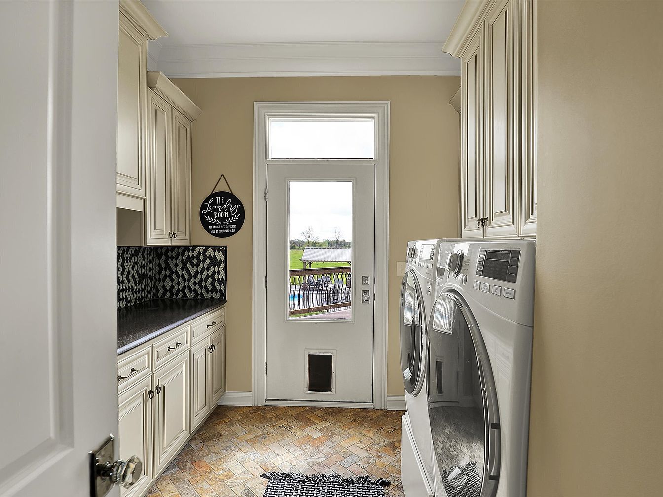 This laundry room features a compact yet functional layout with modern appliances positioned on the right side. Cream-colored cabinetry with classic molding lines the left wall, providing ample storage both above and below a sleek black countertop. A distinctive black and white diamond-patterned backsplash adds contrast and visual interest. Neutral beige walls create a warm atmosphere, complemented by a herringbone-patterned floor in earthy tones. The space is brightened naturally by a glass-paneled door with an adjacent transom window, offering direct access to the outdoors and bringing in natural light. A small black sign adds a touch of personality near the door.