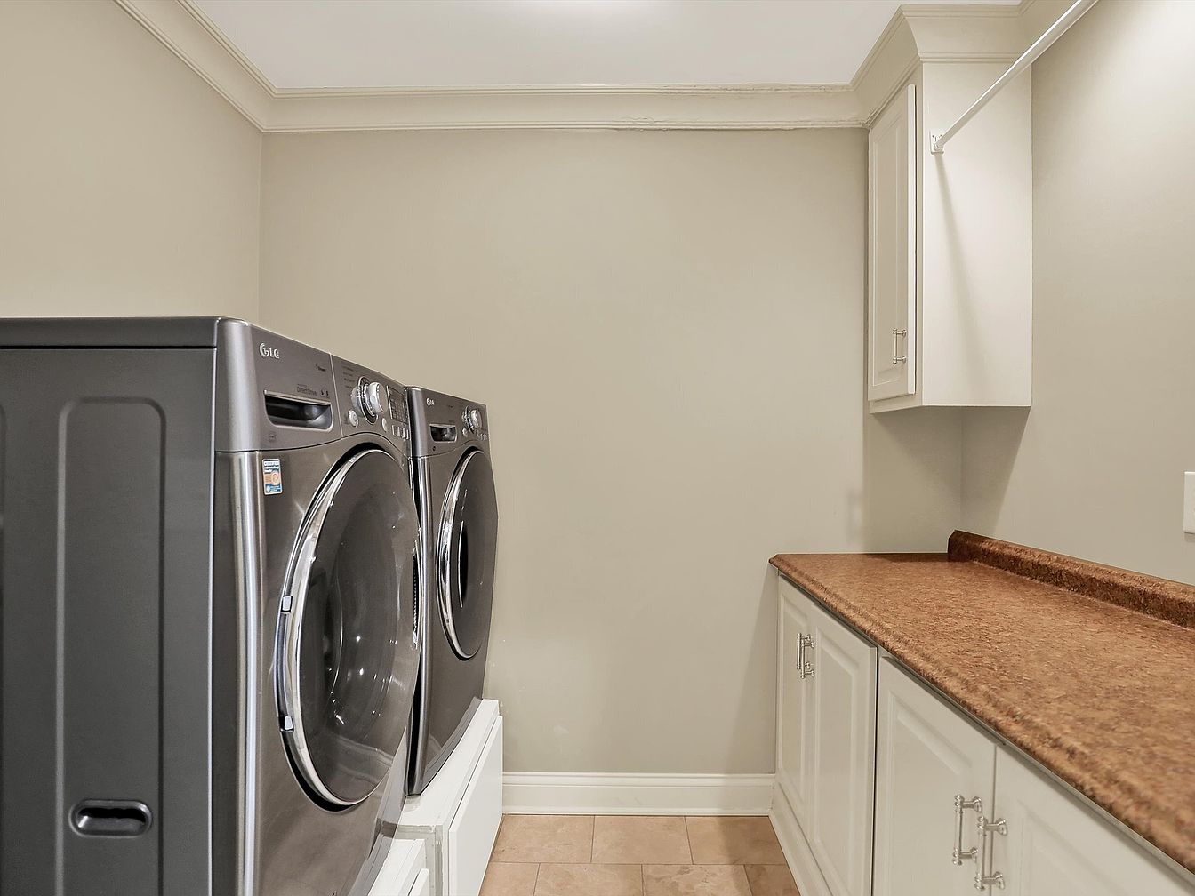 This laundry room features a clean and simple layout with modern front-loading stainless steel washer and dryer units positioned side by side on white pedestal bases. The walls are painted in a soft beige tone, complemented by white crown molding and baseboards that add a touch of elegance to the space. Opposite the appliances, a long countertop with a warm brown, stone-like finish runs along the wall, supported by white cabinetry offering ample storage. Above the counter, a matching white upper cabinet provides additional space, enhancing the room’s functionality and creating an organized, efficient workspace.