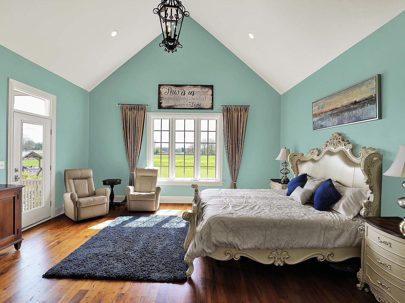 This master bedroom features a high vaulted ceiling painted white, contrasting beautifully with soft teal walls that create a tranquil ambiance. The polished wood floor adds warmth and elegance, complemented by a deep navy blue shag rug that anchors the seating area. Two plush beige recliners sit near a tall window framed by gold-toned curtains, offering a serene spot for relaxation with views of the greenery outside. The ornate cream-colored bed with intricate carvings is dressed in neutral bedding accented with navy cushions, flanked by matching vintage-style nightstands and classic lamps. A landscape painting and a sentimental wooden sign bring personality and charm to the space.