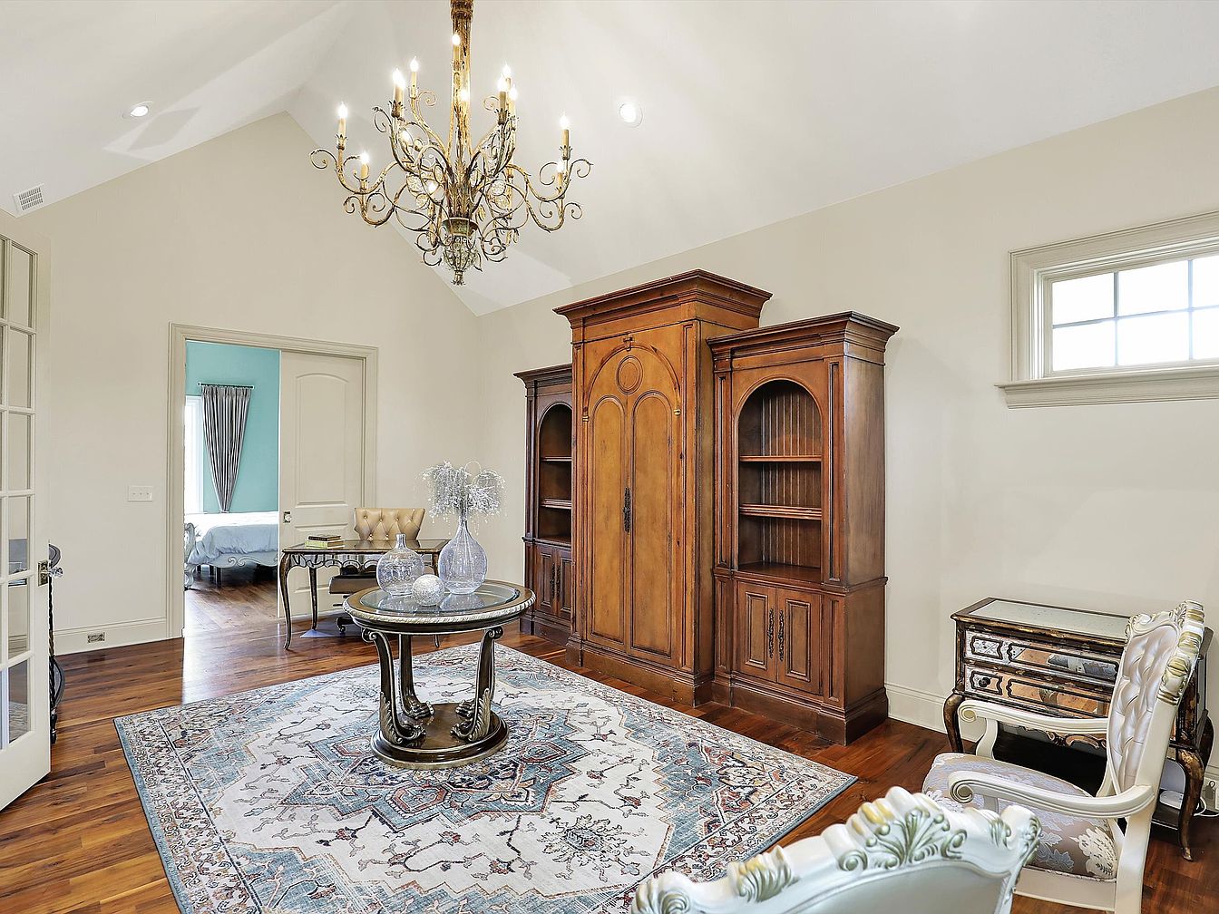 This sitting room features a high vaulted ceiling with a grand, ornate chandelier serving as a striking focal point. The walls are painted in a soft, neutral cream tone, enhancing the room’s airy and bright ambiance. Rich, warm hardwood floors anchor the space, complementing the prominent, classic wooden armoire and matching side cabinets with intricate detailing. A vintage-style round glass-top table sits atop a large area rug with a muted blue and beige geometric pattern. Traditional carved chairs with subtle upholstery provide elegant seating, while a small mirrored chest adds a touch of sophistication near the window, which allows natural light to gently illuminate the room.