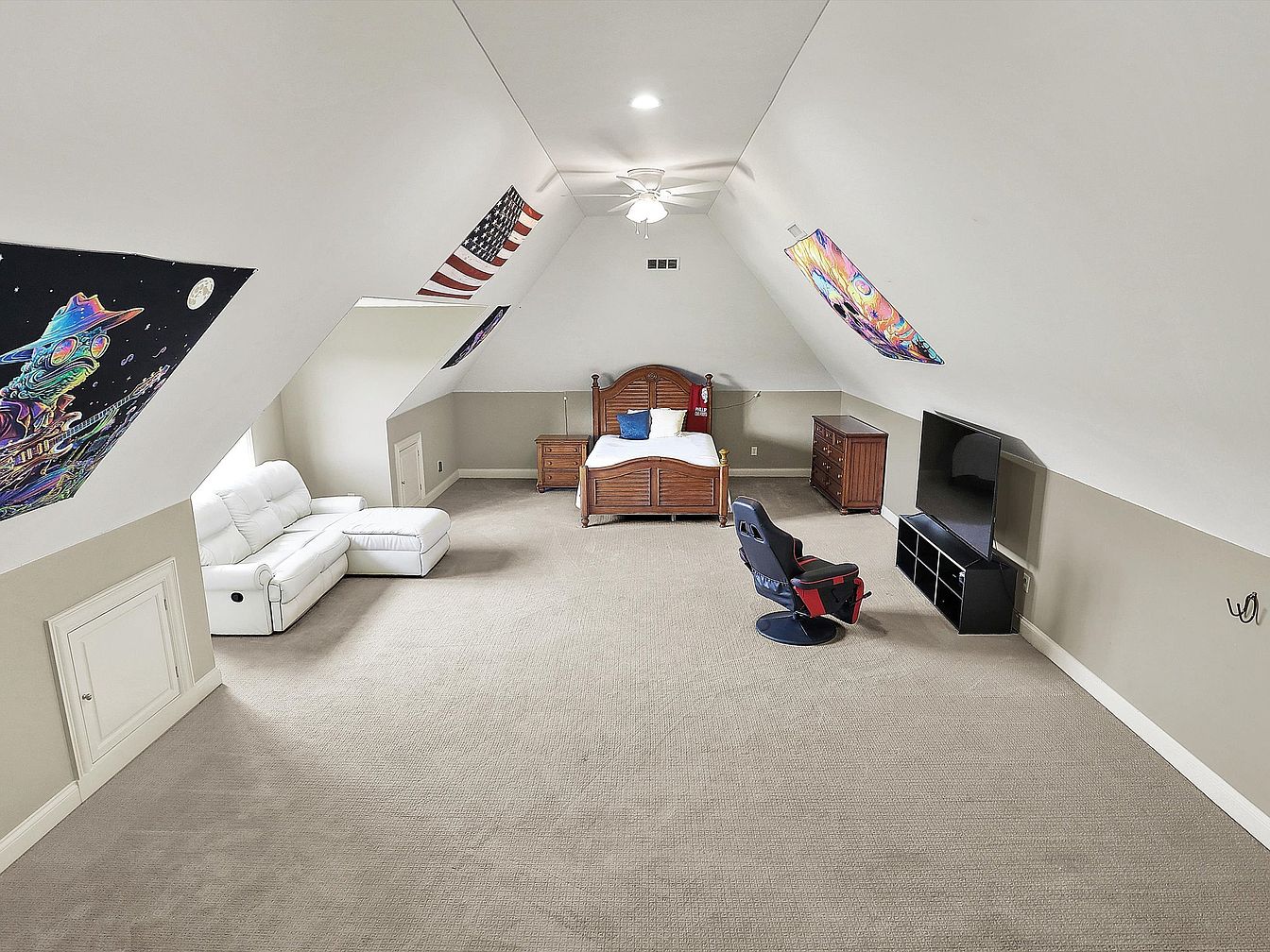 This spacious attic room features a vaulted ceiling accentuated by recessed lighting and a ceiling fan, creating an airy feel despite the angled walls. The color palette combines soft white on the upper walls with a light taupe hue on the lower half, adding subtle contrast. Furnished with a traditional wooden bed and matching dresser, the space is comfortably arranged for both rest and entertainment. A white sectional sofa and a gaming chair face a large flatscreen TV on a sleek black stand. The room’s aesthetic is personalized with eclectic, colorful wall hangings and an American flag, blending cozy and playful elements.