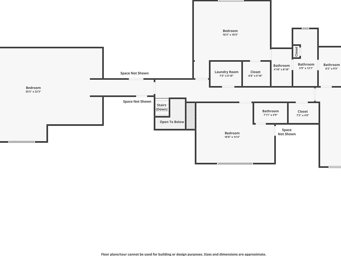 This upper-level floor plan reveals a spacious layout with three large bedrooms, multiple bathrooms, and ample closet space. The substantial master bedroom measures 35’5″ by 22’3″ and is accompanied by several bathrooms strategically positioned for convenience. A central hallway connects the bedrooms, while a laundry room is situated to one side, enhancing practicality. Stairs leading down from the center create an “open to below” feature, providing an airy feel between floors. The floor plan is designed for efficient flow and privacy, showcasing a balance between open and enclosed spaces.