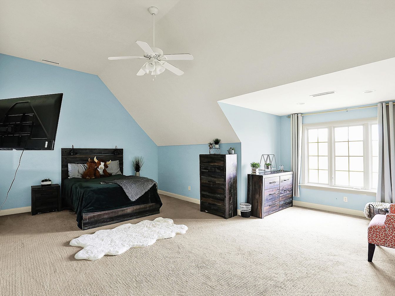 This bedroom features soft blue walls creating a calming atmosphere, paired with beige carpeting that adds warmth underfoot. A dark wood bed frame with a matching nightstand anchors one side, accompanied by plush stuffed toys adding a cozy touch. Across from the bed is a wall-mounted TV, offering a modern entertainment element without sacrificing floor space. Natural light floods in through a wide, multi-pane window dressed in simple gray curtains, balancing softness and brightness. Two dark wood dressers align with the room’s rustic vibe, and a small white furry rug introduces texture and subtle luxury. The sloped ceiling with a white fan contributes architectural interest while enhancing airflow.