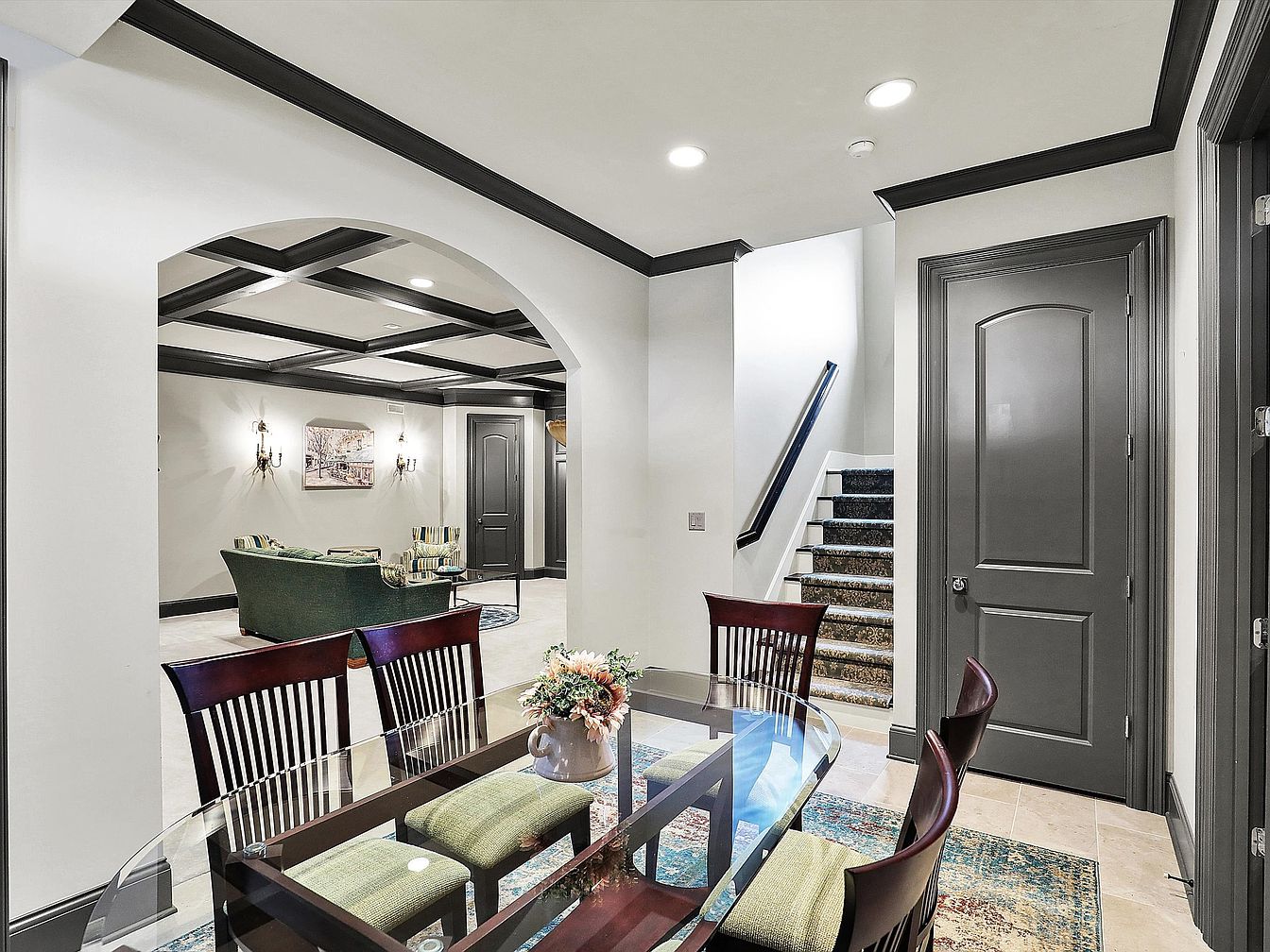 This basement dining area features a sleek glass-top table surrounded by dark wooden chairs with olive-green cushions, all positioned on a colorful, patterned rug. The space opens through a large, rounded archway into an adjacent sitting area, where a green sofa and striped chairs are arranged. The ceiling showcases contrasting black beams against white panels, mirrored by the black crown molding and door trims, which create a bold, modern aesthetic. Neutral walls and recessed lighting balance the darker elements, while a staircase with patterned carpet leads upward, adding texture and depth to the design.
