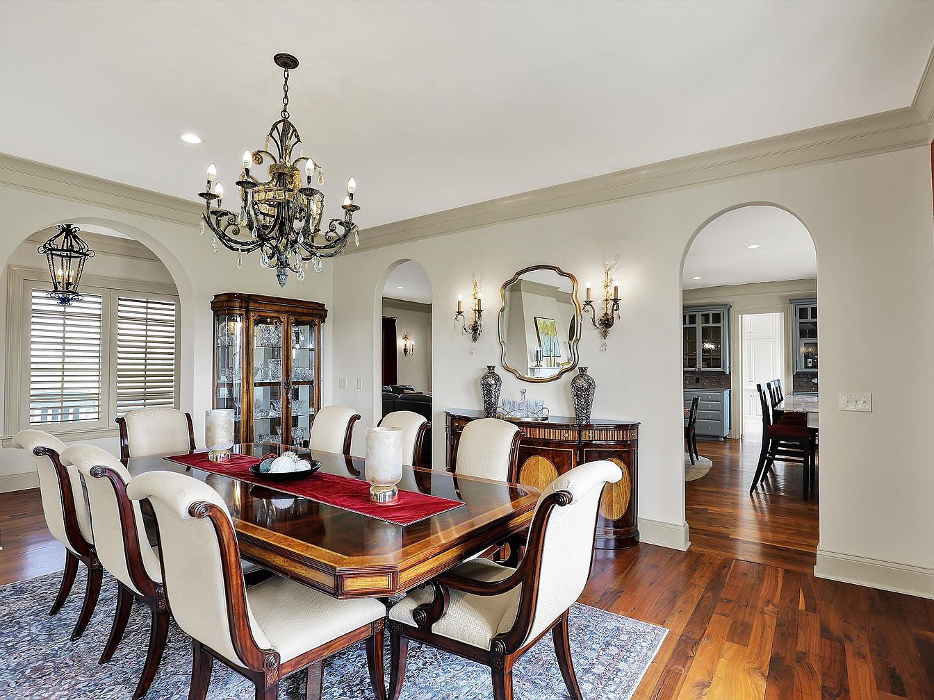This elegant formal dining room features a large, polished wooden table with intricate detailing, surrounded by eight high-back chairs upholstered in a creamy fabric with dark wood frames. A rich, deep red table runner adds a pop of color against the warm wood tones. The walls are painted in a soft neutral shade, enhanced by classic crown molding and baseboards. Ornate lighting fixtures, including a chandelier with crystal accents and wall sconces, contribute to the sophisticated ambiance. The floor is a polished hardwood, partially covered by a patterned area rug. Arched doorways open to adjoining rooms, visually expanding the space.