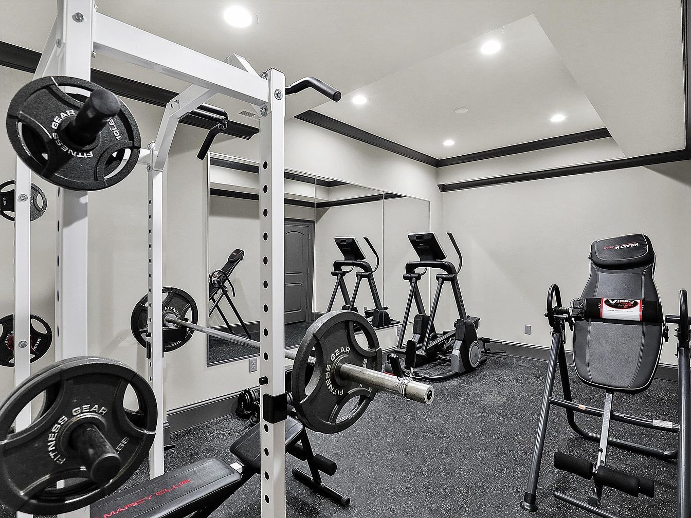This dedicated fitness room features a sleek and functional design emphasizing modern convenience. The space includes weightlifting equipment, an adjustable bench, and a power rack with multiple loaded barbells, enabling a versatile strength training routine. Two elliptical machines provide options for cardiovascular exercise, positioned near a large wall mirror that visually expands the room and allows for form monitoring. The room’s walls are painted in soft neutrals with dark trim accents framing the ceiling and doorway, complemented by recessed lighting that ensures bright, even illumination across the rubberized floor, ideal for workout safety and comfort.