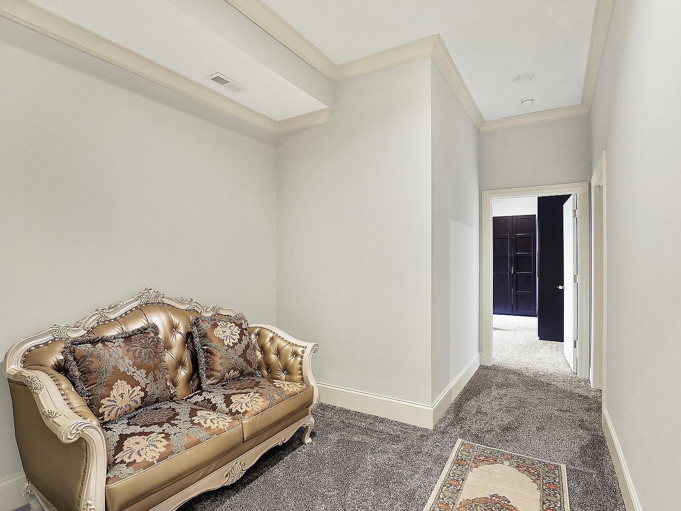 This cozy hallway corner features soft gray walls complemented by creamy white trim and crown molding, creating a serene backdrop. A luxurious vintage-style loveseat with an ornate, carved wooden frame and tufted, gold-toned upholstery anchors the space, paired with two richly patterned pillows in deep earth tones. The plush gray carpet adds warmth underfoot, extending through the hallway that leads to adjacent rooms. Near the entrance of the hallway, a small area rug with intricate designs adds a subtle decorative touch. The hallway’s clean lines and neutral palette invite a sense of calm and understated elegance.