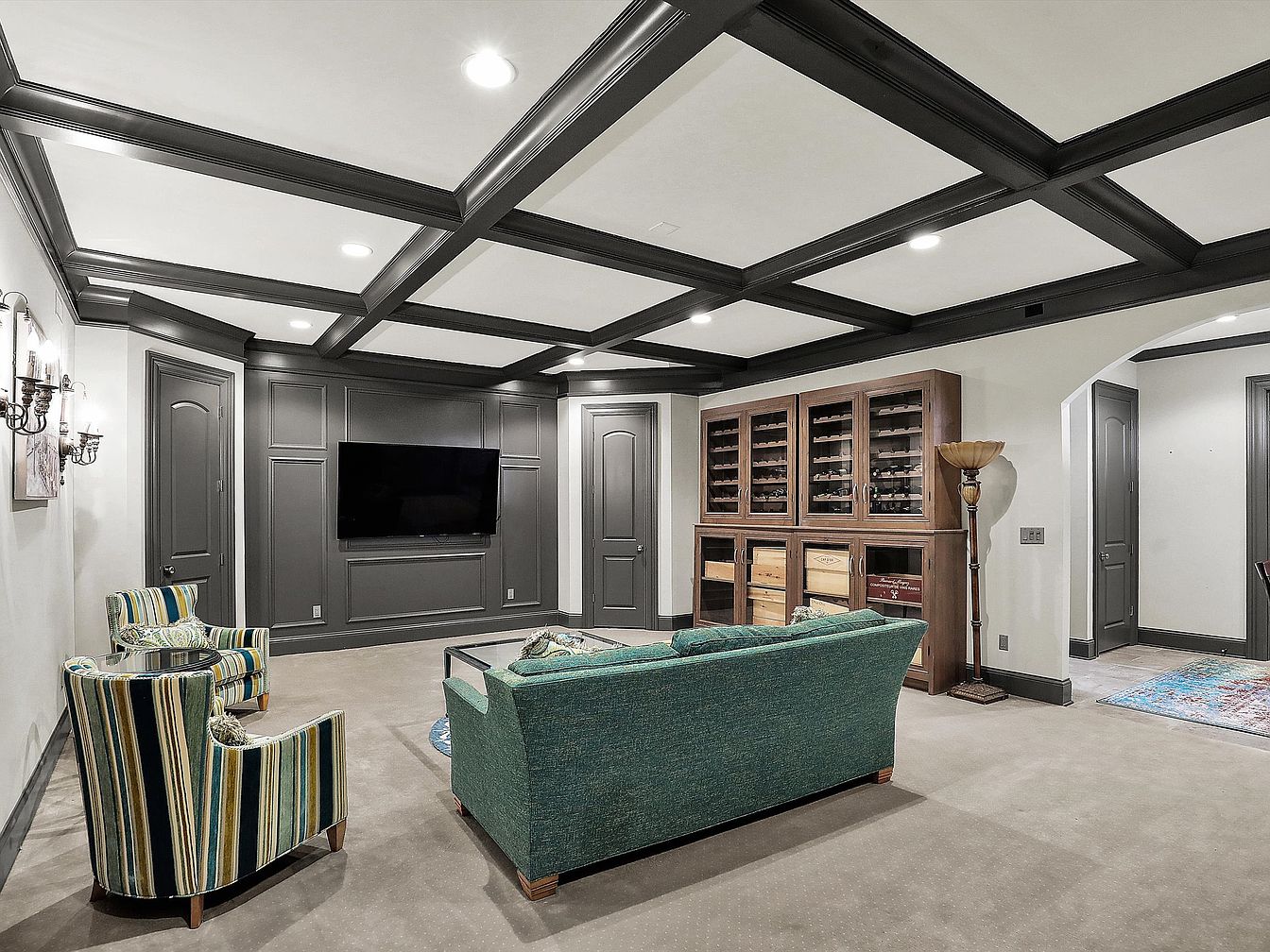 This inviting basement media room features a sophisticated ceiling design with dark, coffered beams that contrast elegantly against the light ceiling panels. The walls and trim are painted in muted gray tones, adding to the room’s refined atmosphere. A wall-mounted flat-screen TV anchors the entertainment area, accompanied by a plush green sofa facing it for comfortable viewing. Two striped armchairs with coordinating colors offer additional seating next to a small side table. On one side, a wooden wine cabinet with glass doors proudly displays an extensive wine collection, while a vintage floor lamp adds warmth to the neutral carpeted floor. Doorways and archways lead seamlessly to adjoining spaces, enhancing the room’s open, airy feel.