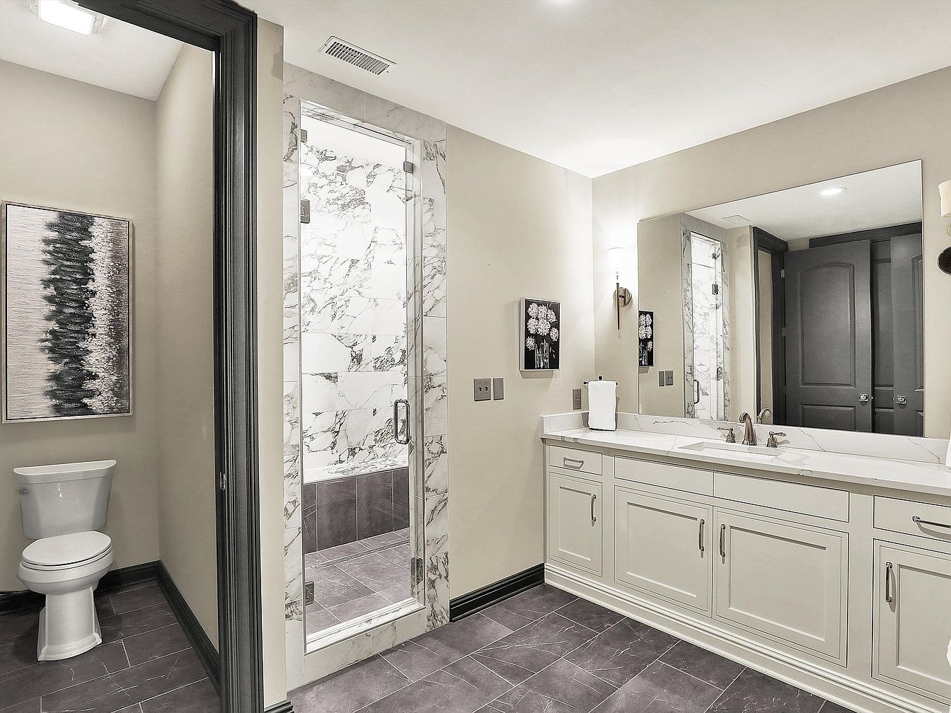 This bathroom features a spacious double vanity with a long marble countertop and white cabinetry accented by sleek silver hardware. The vanity is complemented by a large frameless mirror, enhancing the sense of openness and light. Light walls contrast with dark floor tiles and matching baseboards, adding depth to the neutral color palette. To the left, a glass-enclosed shower with marble-tiled walls and a modern design provides a luxurious focal point, while a separate toilet area offers privacy. Soft, understated wall lighting completes the elegant, contemporary feel of this bathroom space.