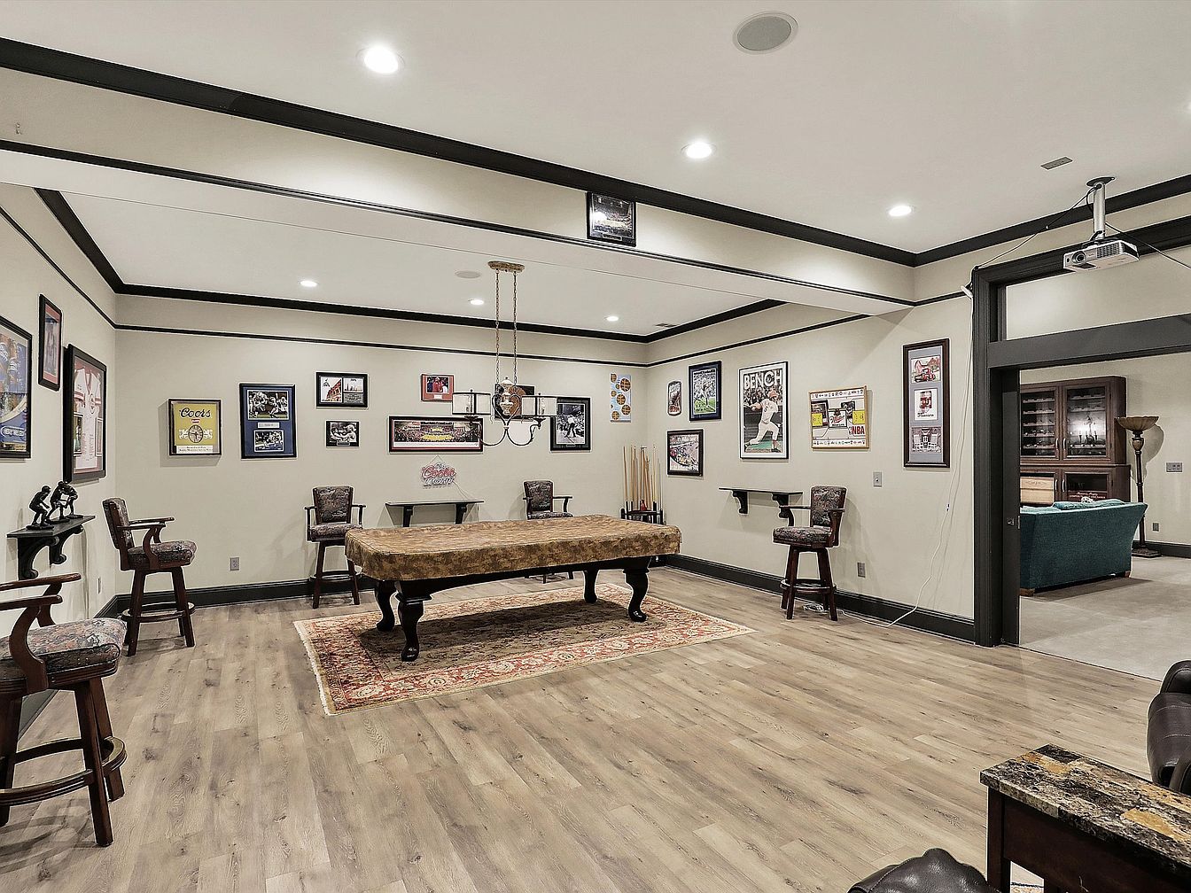 This spacious game room features a central pool table covered with a protective cloth, placed on a classic patterned rug that adds warmth to the light wood flooring. Surrounding the table are several upholstered bar stools with wooden frames, inviting social gatherings. The walls are painted in a soft beige tone with black trim accentuating the ceiling and baseboards, creating a refined contrast. Framed sports memorabilia and vintage posters adorn the walls, enhancing the room’s cozy and nostalgic atmosphere. Recessed ceiling lights provide even illumination, while a hanging chandelier over the pool table adds charm. An open doorway leads to an adjoining room with plush seating and a glimpse of a wine cabinet, contributing to the entertainment vibe of the space.