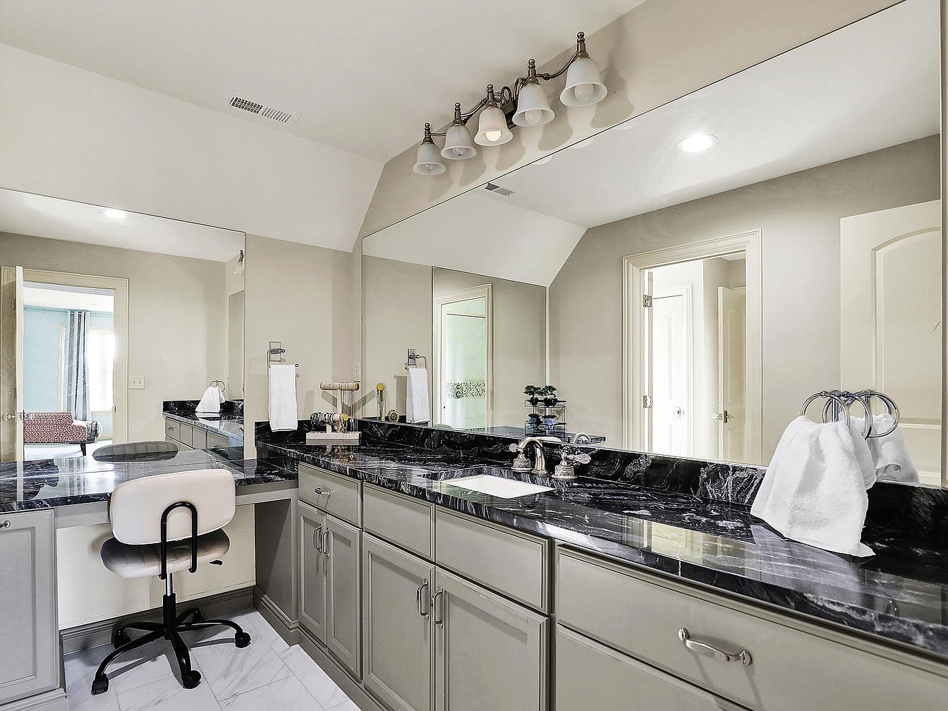 This bathroom vanity area features a spacious L-shaped black marble countertop with white veining, providing both elegance and functionality. Soft gray cabinetry with polished silver handles offers ample storage beneath the counter. A large wall-mounted mirror spans the entire length of the vanity, enhancing the sense of openness and light. The space is softly illuminated by a row of five classic bell-shaped light fixtures in a brushed nickel finish. A built-in seating nook with a cushioned white swivel chair adds comfort and practicality, while the light neutral wall tones and white marble-patterned floor tiles create a clean, sophisticated atmosphere.