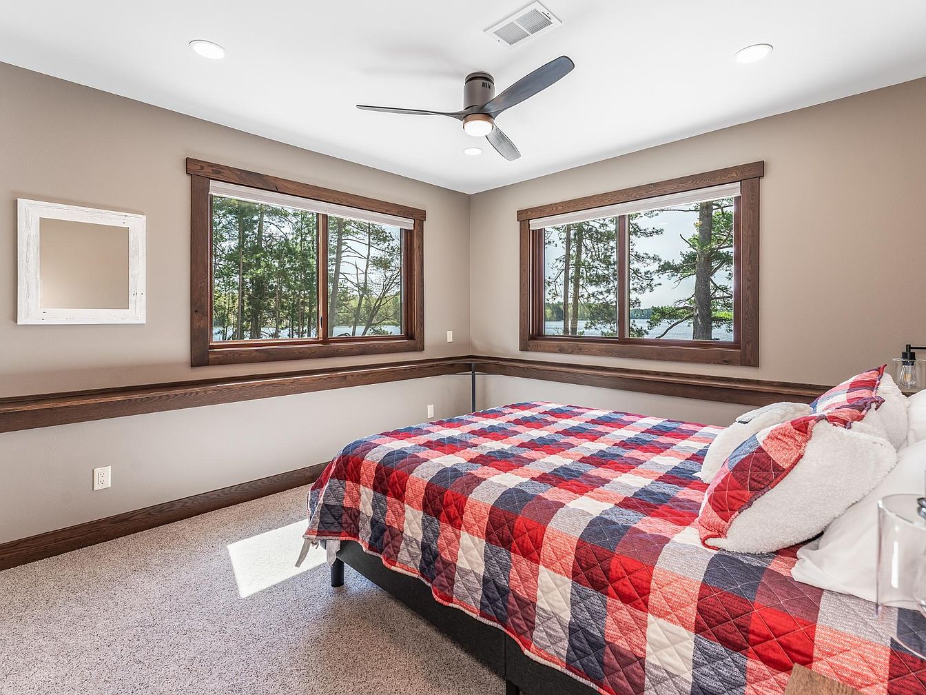This bedroom features a cozy corner layout with large corner windows framed in rich wood trim, allowing ample natural light and providing serene views of surrounding trees and water. The walls are painted a warm beige tone, complementing the soft neutral carpet underfoot. A contemporary ceiling fan with dark blades and integrated light hangs centrally, adding modern functionality. The bed is dressed in a bold red, white, and blue plaid quilt, echoed in matching pillows, adding a pop of color and a touch of rustic charm. Minimalist decor with a simple white-framed mirror enhances the tranquil atmosphere.