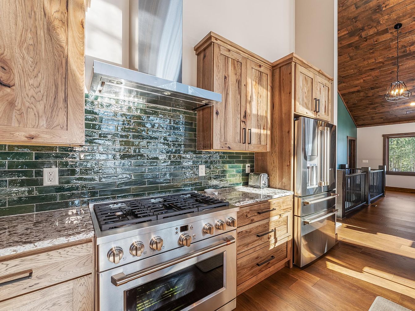 This kitchen corner features a harmonious blend of rustic and modern design elements. Natural wood cabinetry with visible knots and grain complements the warm hardwood flooring, creating an inviting atmosphere. The backsplash showcases glossy dark green tiles arranged horizontally, adding both texture and a pop of color behind a sleek stainless steel gas stove and oven. Above the stove, a minimalist stainless steel range hood reflects light, enhancing the sense of space. To the right, a large stainless steel refrigerator blends seamlessly with the wood cabinetry, while a subtle view of the open-plan dining area reveals a high, wood-paneled ceiling and black metal railing with large windows allowing natural light to flood the space.