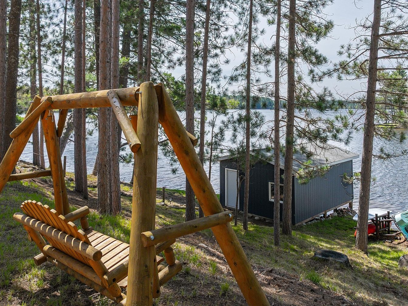 This tranquil outdoor spot features a rustic wooden swing crafted from thick logs, positioned on a gentle slope shaded by tall pine trees. The natural wood finish blends harmoniously with the surrounding forest, emphasizing a back-to-nature aesthetic. Beyond, a serene lake reflects the light sky, while a small boathouse or cabin painted in muted gray anchors the waterfront scene. The setting evokes peaceful relaxation with a seamless blend of earthy textures and cool water tones, inviting one to enjoy quiet moments amidst nature’s calming ambiance just steps away from the cozy lake structure.