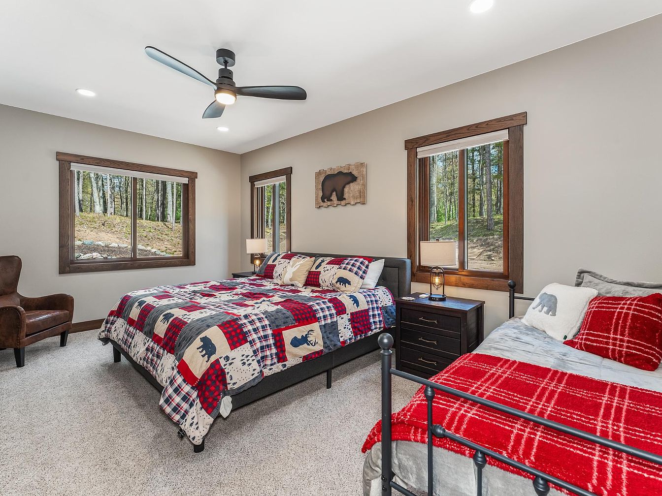 This inviting bedroom features a blend of rustic and cozy elements with a nature-inspired theme. Two beds, including a large bed with patchwork bedding of plaid, bear, and deer motifs, and a smaller bed accented with red and gray plaid throws, create a warm, lodge-like atmosphere. Dark wood window frames and furniture provide striking contrast against muted beige walls and soft, neutral carpeting. Natural light filters through three windows overlooking a wooded landscape. The modern black ceiling fan complements the room’s clean lines, while subtle bear-themed decor adds charm and personality to this comfortable, nature-themed retreat.
