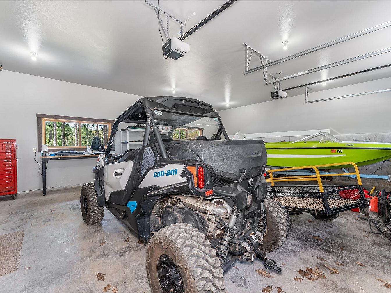 This spacious garage features a utilitarian layout, designed for storing off-road and recreational vehicles. The concrete floor shows subtle wear and scattered leaves, adding to the rugged, practical vibe. Bright, recessed lighting fixtures provide ample illumination across the white walls and ceiling, enhancing the clean yet functional atmosphere. A large off-road Can-Am vehicle sits prominently in the center, accompanied by a vibrant lime-green boat secured on a trailer in the background. Workbench space along the left wall includes a red tool chest and window that offers natural light and views of surrounding greenery, balancing utility and outdoor connection.
