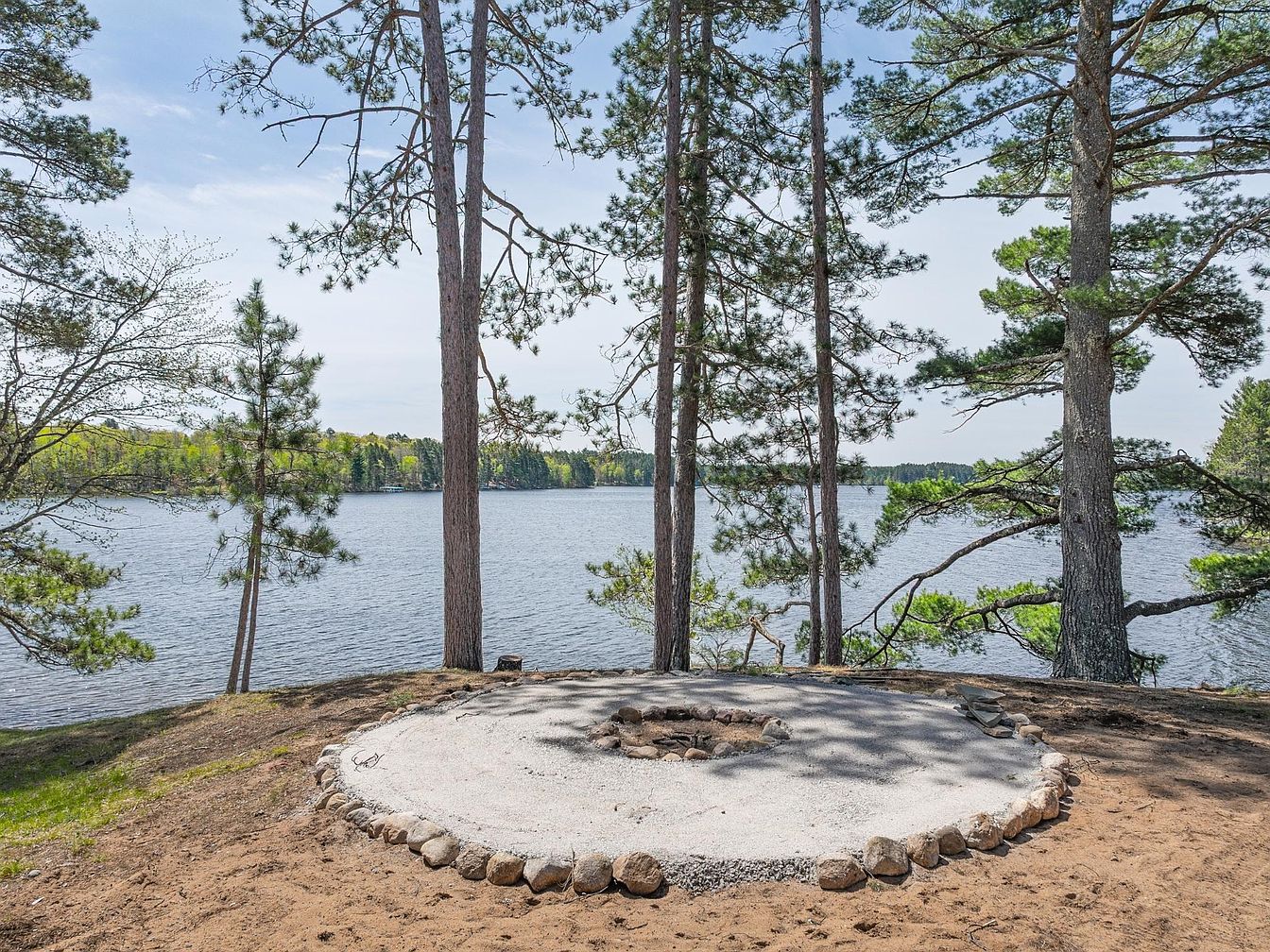 This serene outdoor spot features a circular fire pit bordered by natural stones, situated on a sandy patch that gently slopes toward a peaceful lake. Tall pine trees frame the space, creating a natural canopy and offering partial shade. The lake beyond provides an expansive water view with a lush tree line on the horizon, enhancing the tranquil wilderness vibe. The area feels perfect for gathering around the fire to enjoy evenings amidst nature. The combination of earthy textures, from sandy soil to rough bark, complements the calm, open sky and water backdrop.
