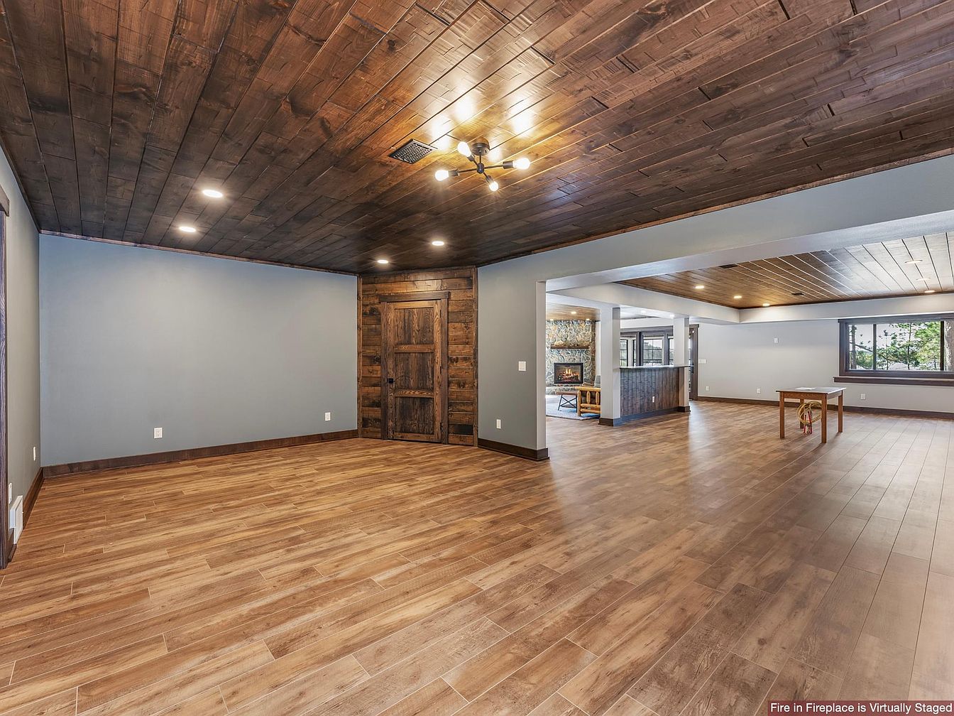 This spacious living area blends rustic charm with modern touches, featuring a rich wood plank ceiling and warm wood-look flooring that extends throughout the open floor plan. Soft gray-blue walls contrast gently with the dark wood door and trim, emphasizing the cozy yet refined atmosphere. Recessed lighting and a contemporary ceiling fixture provide even, inviting illumination. The room opens into a connected space with a stone fireplace and large windows that bring natural light and outdoor views inside. The overall design balances natural textures and neutral tones to create a welcoming, versatile environment.