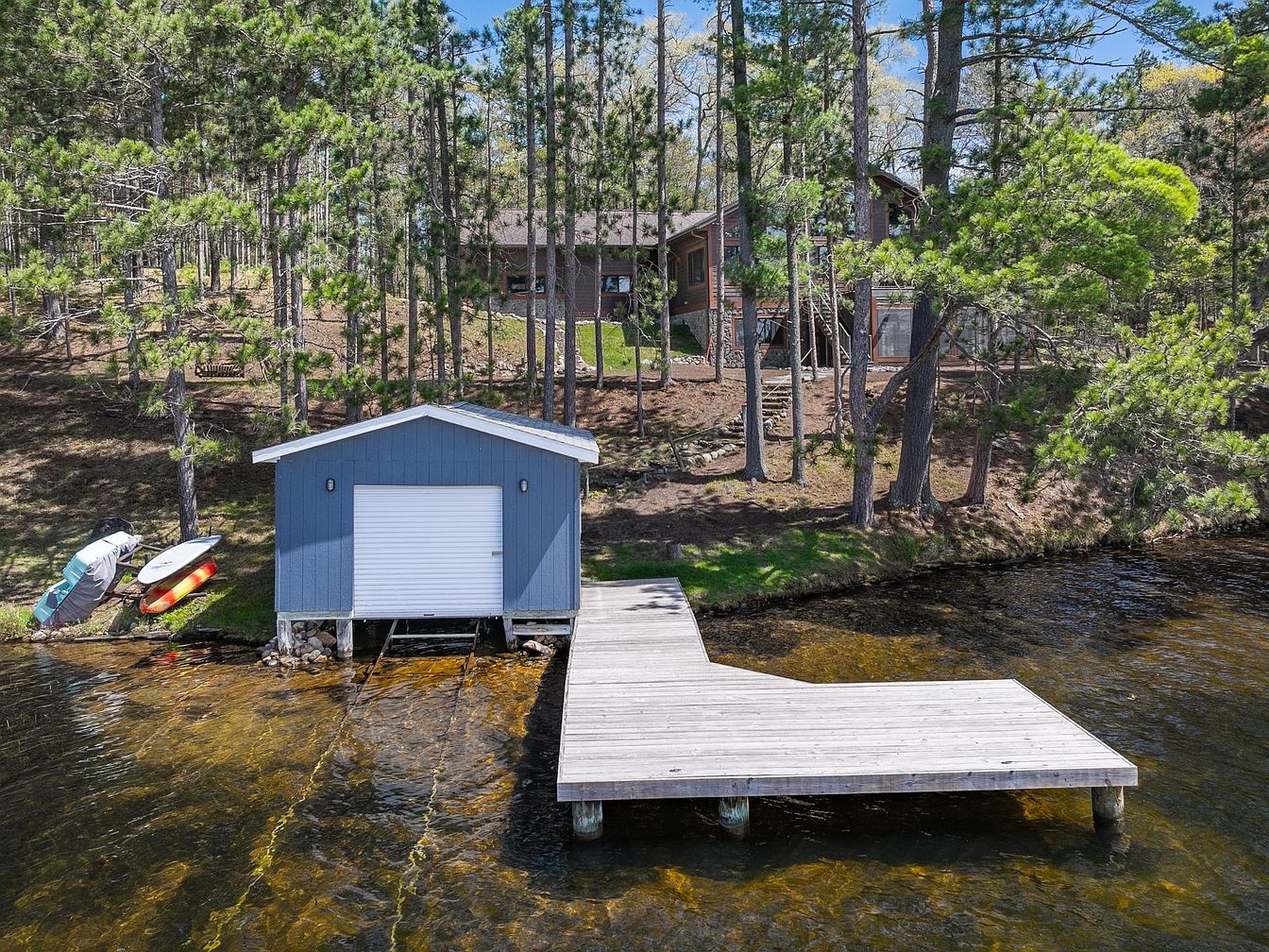 Set against a backdrop of tall pine trees, this serene lakeside boathouse and dock provide a peaceful retreat. The structure features a neat blue exterior with a white roll-up door, perfectly complementing the natural tones of the surrounding forest and water. The dock extends into the clear, shallow water, offering ample space for boats or leisurely lake access. Adjacent to the boathouse, several kayaks and paddleboards rest on the grassy shore, highlighting active outdoor lifestyle possibilities. The nearby cabin, partially visible on an elevated slope, adds a rustic charm to this tranquil waterfront setting.