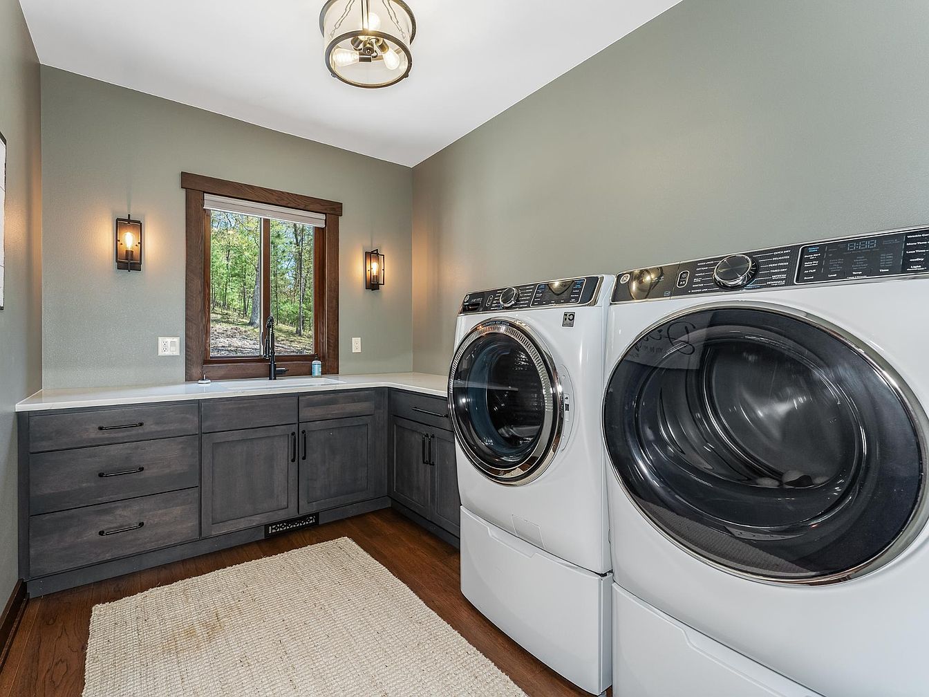 This laundry room presents a clean, efficient layout with a modern yet cozy aesthetic. Positioned side-by-side, the white front-loading washer and dryer feature sleek digital controls with chrome accents. Rich dark gray cabinetry lines the adjacent walls, topped with a smooth white countertop that provides ample folding and workspace. The earthy green walls create a calm backdrop, enhanced by dark wood trim around the window, which overlooks a wooded outdoor scene. Warm wooden floors and a textured neutral area rug add warmth, while black metal light fixtures on the walls and ceiling bring subtle industrial charm and soft lighting to the space.