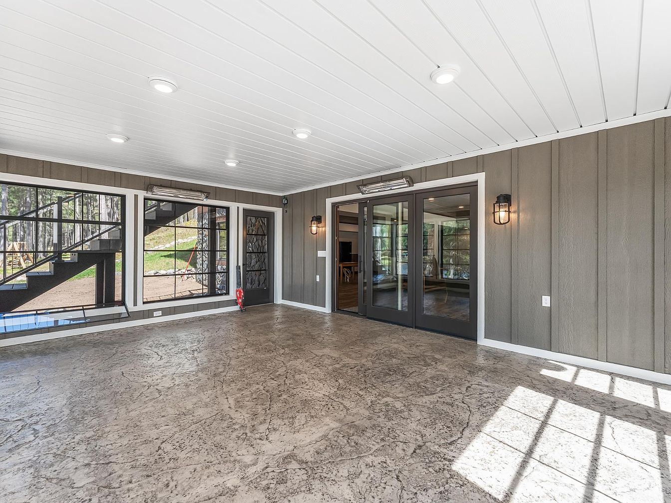 This spacious sunroom or enclosed patio features a bright, airy atmosphere with large black-framed windows that allow natural light to flood the room. The textured stone-like flooring adds a rustic touch, complementing the vertical wood panel walls in a muted taupe color, creating a warm and inviting space. The white paneled ceiling with recessed lights offers a modern contrast, while two wall-mounted industrial-style lantern sconces add subtle charm. Heated panels above the windows suggest a cozy environment for cooler days. The room connects seamlessly to the interior via large glass French doors, offering indoor-outdoor living flexibility.