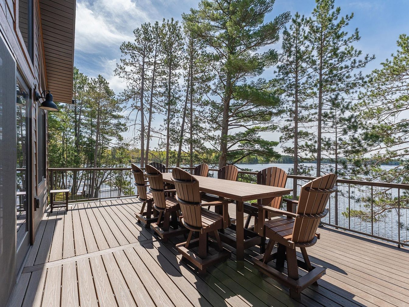 This spacious outdoor deck offers a tranquil dining space with a long wooden table surrounded by eight matching high-back chairs, perfect for gatherings. The deck flooring features wide, light brown planks that complement the dark wood furniture, creating a harmonious natural aesthetic. The railing with slender metal balusters ensures unobstructed views of the serene lake beyond, framed by tall pine trees that add privacy and a sense of seclusion. The house exterior visible in the corner emphasizes rustic charm with timber siding and a black wall-mounted light fixture, enhancing the overall cozy yet elegant ambiance.