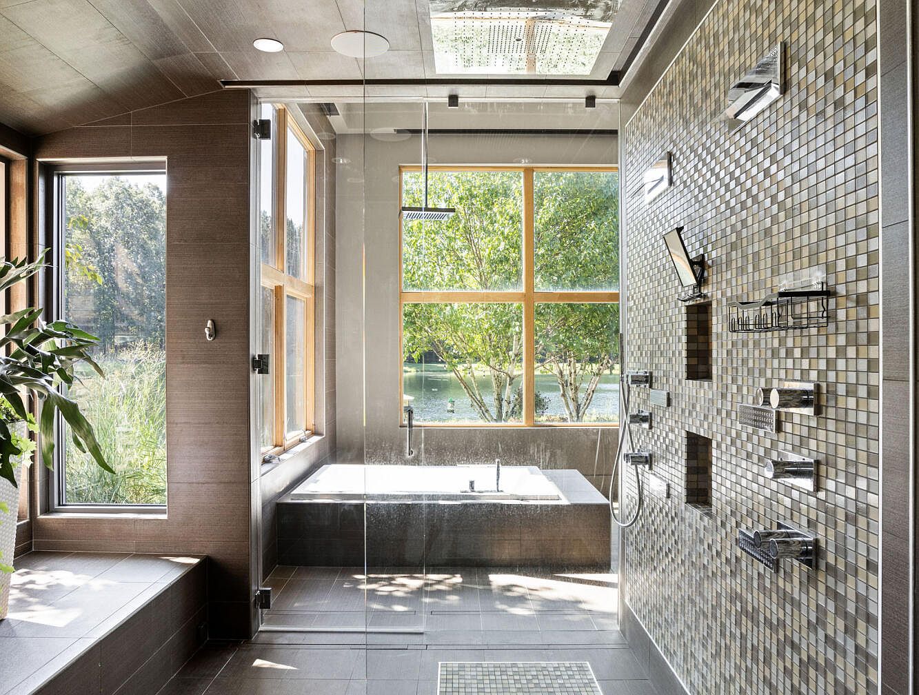 This master bathroom features a spacious, light-filled layout with large windows that provide scenic views of lush greenery and water outside. The walk-in shower is enclosed with clear glass and showcases a mosaic tiled wall in neutral earth tones. Mounted chrome showerheads and controls create a sleek, modern feel, complemented by built-in niches for toiletries and a digital screen. The bathing area includes a deep, rectangular soaking tub framed by dark gray tiles. Warm wood accents around the windows and a muted color palette of taupe and beige add natural warmth and a serene atmosphere.
