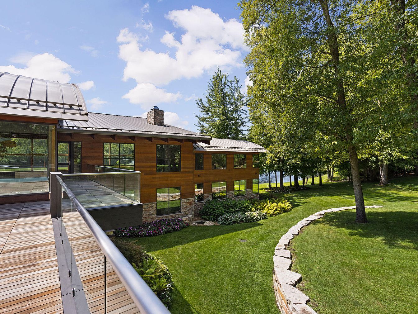 This outdoor balcony features a sleek wood deck with a modern metal and glass railing that offers unobstructed views of the lush backyard. The house exterior combines warm wood siding with stone accents along the lower walls, creating a harmonious blend of natural materials. Large windows provide light and views from inside the home, while the gently curved stone retaining wall delineates a manicured lawn bordered by established trees and garden beds. The surrounding greenery and the glimpse of water beyond the trees evoke a serene, nature-focused atmosphere perfect for relaxation and enjoying the outdoors.