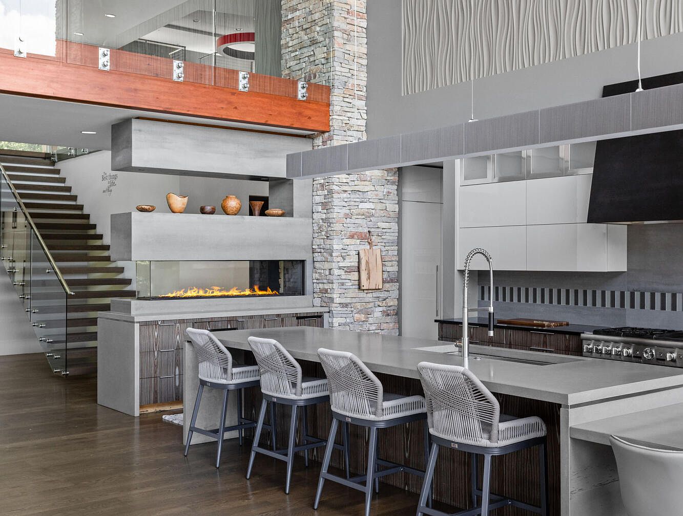 This contemporary kitchen features a sleek, expansive island with a polished concrete countertop and integrated sink, complemented by four high-back bar stools with woven seats and gray frames. The cabinetry combines dark wood textures with minimalist white upper units, creating a balanced contrast. A unique double-sided fireplace with a smooth concrete finish and glass panels separates the kitchen from the adjacent stairway, which has dark wooden steps and glass railings. The stone accent column adds rustic texture, while a modern textured wall panel above the fireplace adds artistic flair, blending natural and industrial elements harmoniously.
