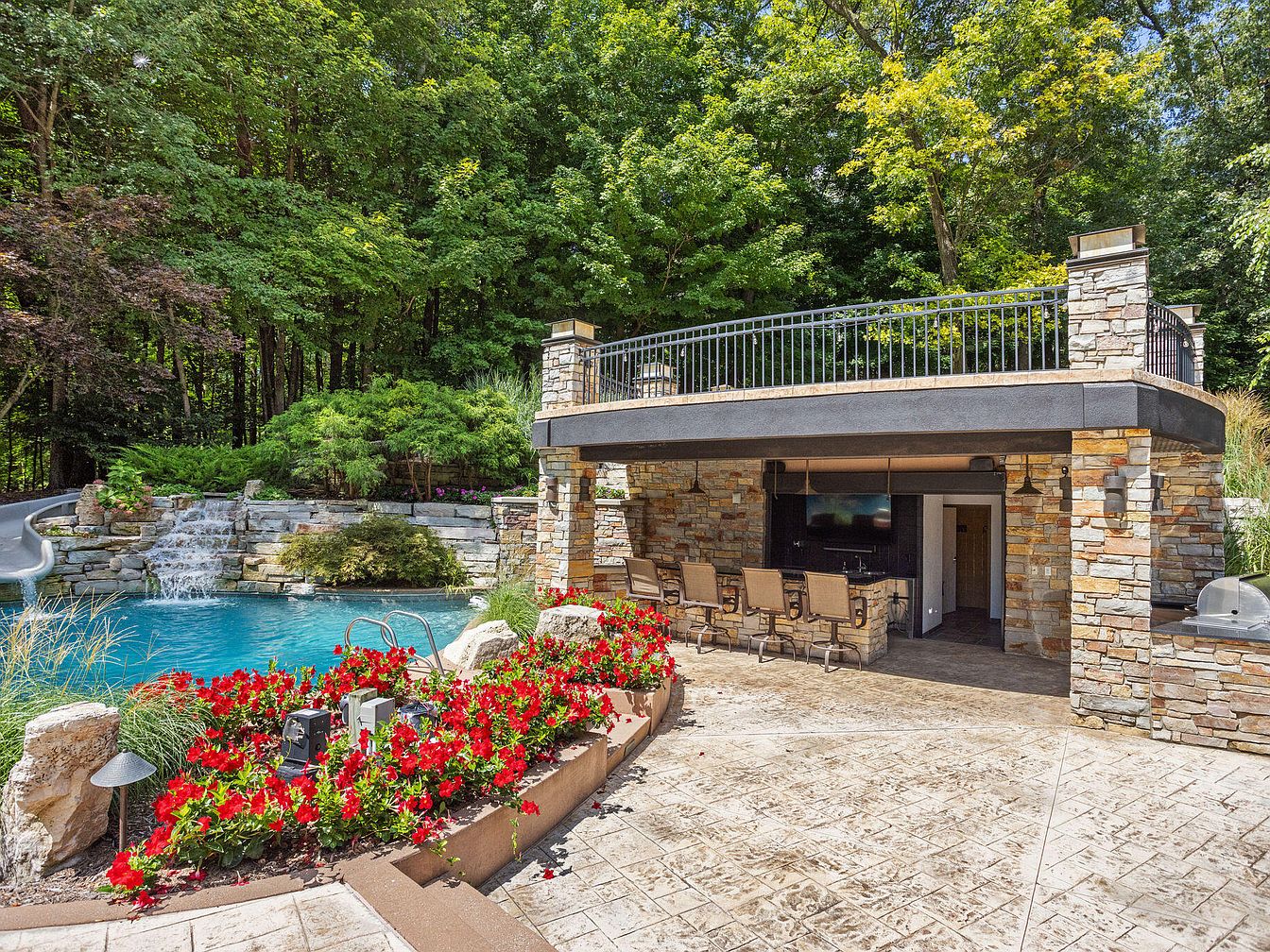 The pool lounge area blends natural and crafted elements, featuring a stone-clad outdoor bar and seating area beneath a covered patio. Four bar stools line the counter, ideal for socializing while enjoying the nearby pool. The pool itself is bordered by a stone waterfall and waterslide nestled among lush greenery, creating a tranquil atmosphere. Bright red flowers in a raised garden bed brighten the neutral stone patio. Above the seating area, a sturdy black metal railing crowns the stonework, adding safety and style while offering views of the surrounding mature trees and landscaping.