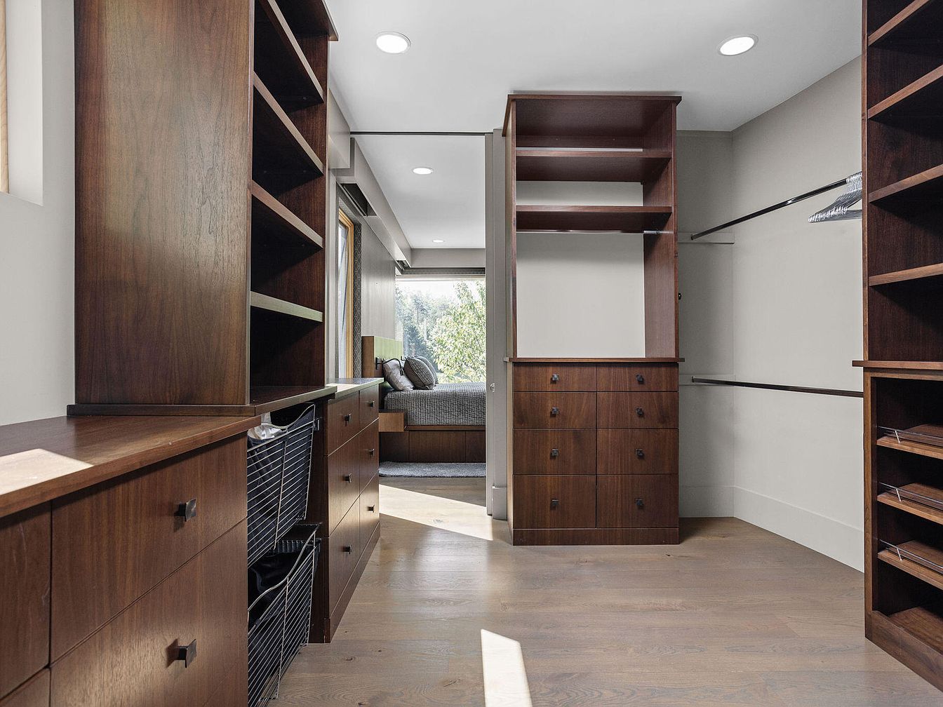 This spacious walk-in closet boasts rich, dark wood cabinetry that contrasts elegantly with the light gray walls and natural wood flooring. A combination of open shelving, drawers, and hanging rods maximize storage options, while metal basket drawers add flexibility. Recessed lighting in the ceiling provides bright, focused illumination. The closet thoughtfully connects to a bedroom, visible through an open doorway, lending a seamless flow between the spaces. The minimalist design, warm wood tones, and clean lines create a sophisticated yet functional dressing area that emphasizes organization and style.