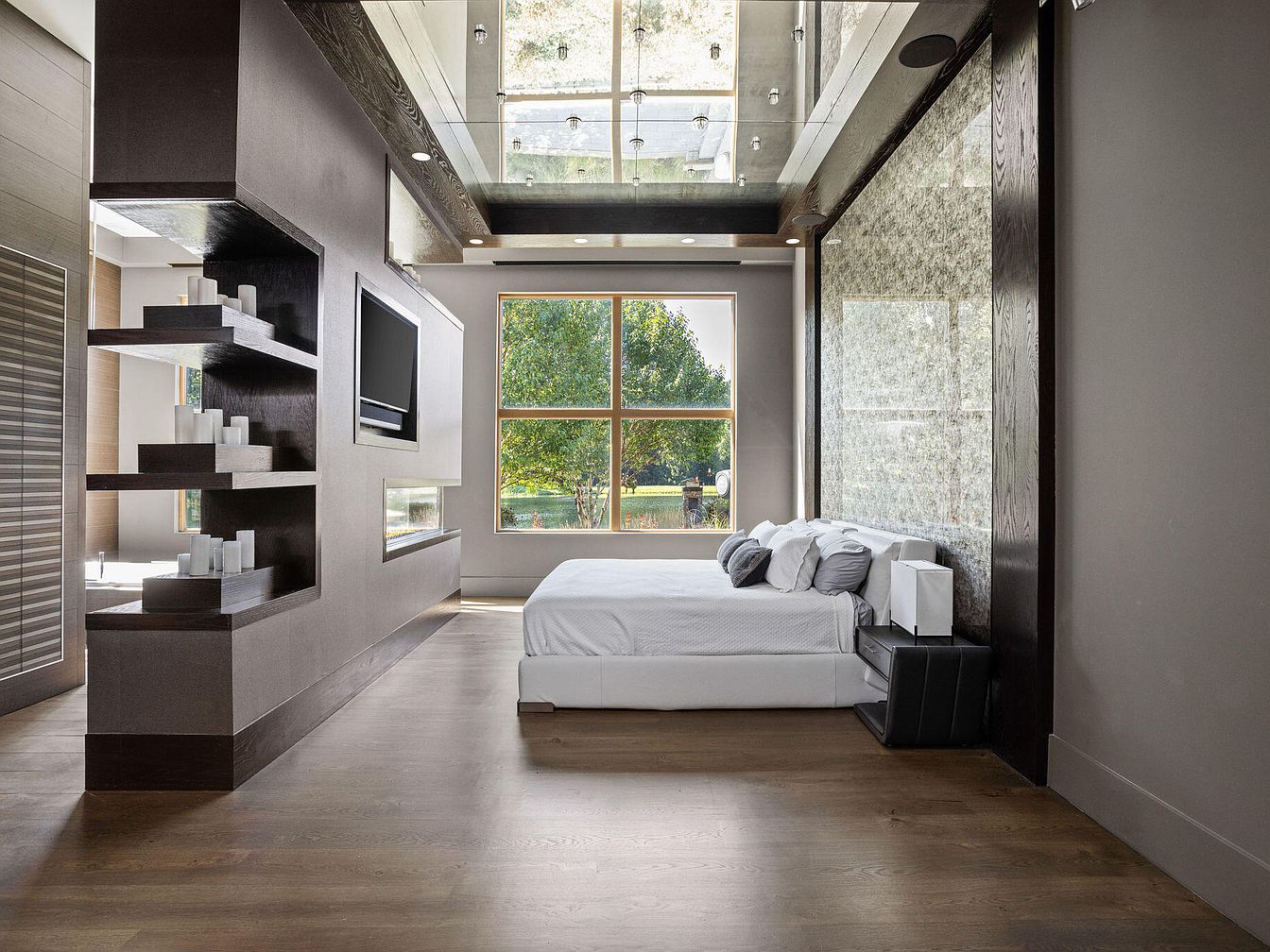 This serene master bedroom features a sleek, minimalist design with a spacious layout. Dominated by neutral tones, the room combines soft grays and rich dark wood accents for a modern, sophisticated look. The bed, positioned against an impressive textured accent wall, is dressed in crisp white bedding with gray pillows for contrast. Large windows flood the space with natural light while framing lush greenery outside, enhancing tranquility. A contemporary shelving unit and integrated wall-mounted TV with a linear fireplace add both function and style. Reflective ceiling panels elevate the sense of openness and light, completing this elegant, calming sanctuary.