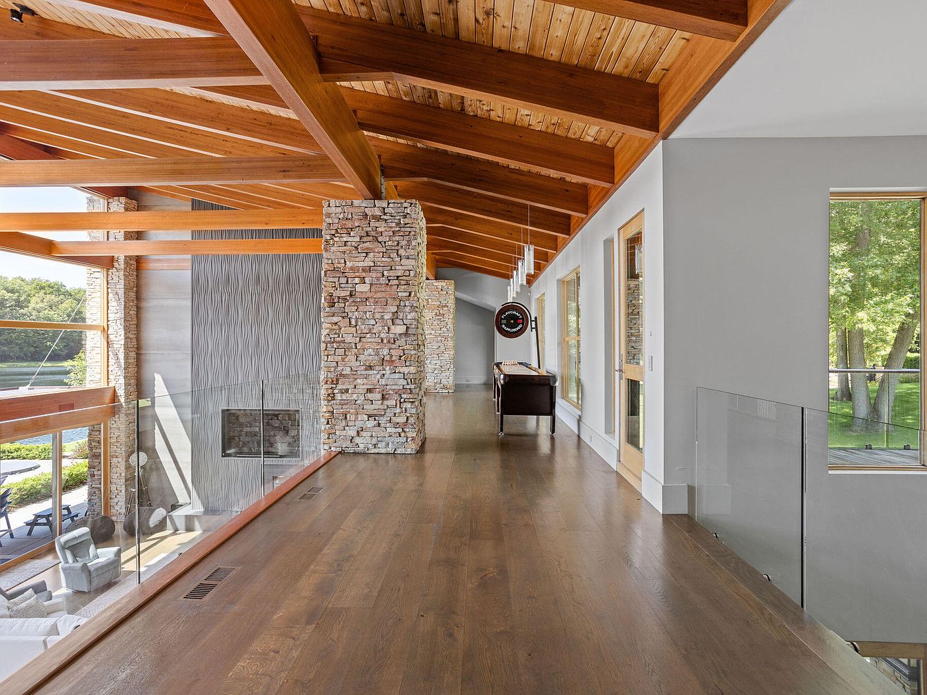 This airy upper hallway features a striking blend of natural materials and modern design. The wooden vaulted ceiling with exposed beams adds warmth and architectural interest, complementing the rich hardwood floor that runs the length of the corridor. Stone columns with textured surfaces provide structural and aesthetic appeal, juxtaposed gracefully with smooth white walls. Along one side, large windows offer inviting views of lush greenery, while a transparent glass railing opens the space visually to the living area below, which includes a contemporary fireplace accentuated by a wave-patterned feature wall. A leather bench and playful dartboard complete this inviting transitional space.