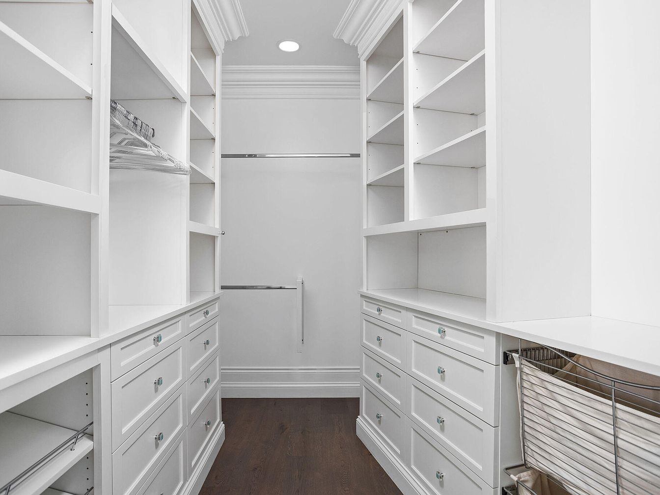 This walk-in closet offers a sleek, modern design featuring extensive white cabinetry that lines both sides of the narrow room. Ample shelving units, drawers with crystal-like knobs, and multiple hanging rods provide versatile storage options. The white color scheme enhances the sense of brightness and cleanliness, paired with a contrasting rich dark wood floor that adds warmth to the space. Decorative crown molding along the ceiling edges introduces a touch of classic elegance. Practicality blends with style in this well-organized, minimalist storage area designed to keep clothing and accessories neatly arranged.