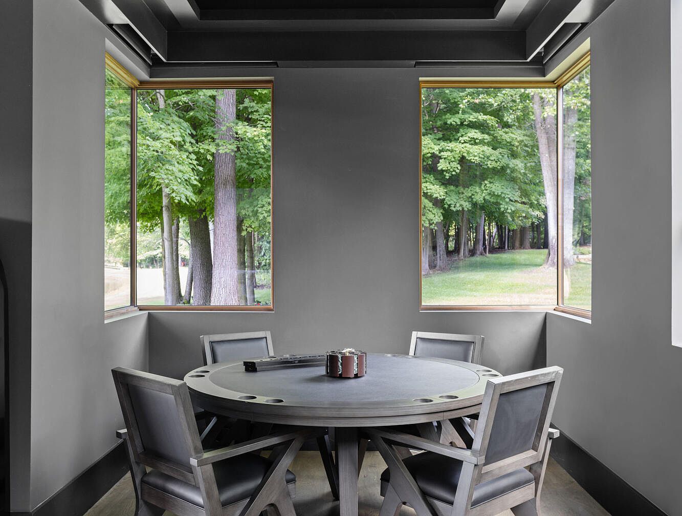 This intimate corner is designed as a game or card playing nook, centered around a sturdy round table with built-in cup holders and surrounded by four matching wooden chairs with cushioned seats and backs in dark tones. The walls and ceiling are painted a deep charcoal gray, creating a sophisticated, cozy ambiance. Three large picture windows framed with natural wood trim invite lush views of the vibrant green forest outdoors, providing ample natural light and a connection to nature. The space’s clean lines and minimalist details emphasize comfort and functionality in a modern rustic style.