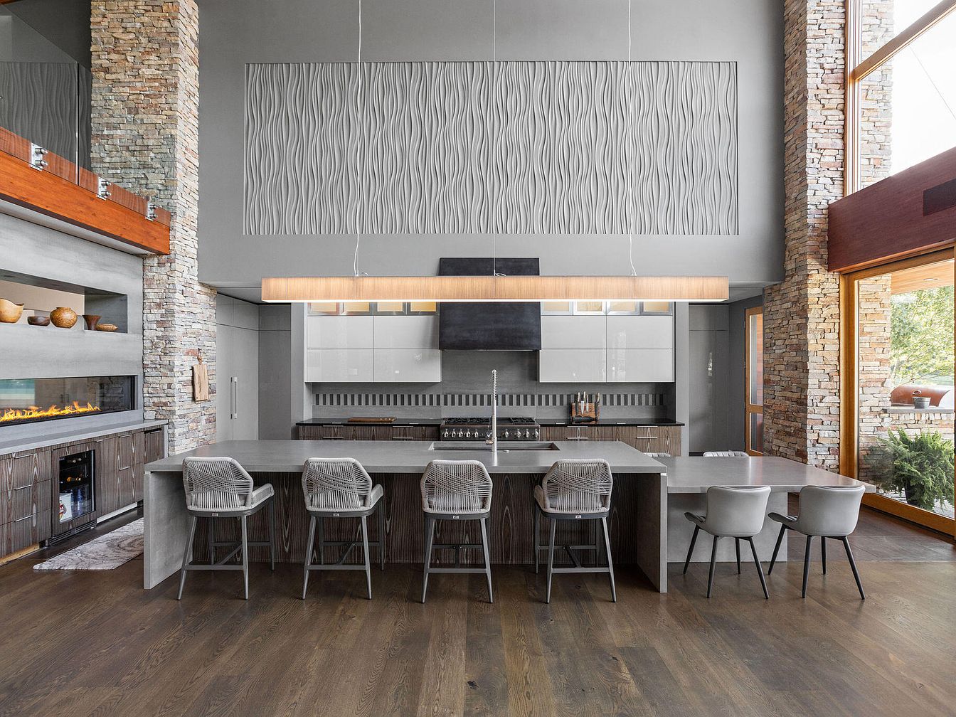 This kitchen centers around a substantial island with a sleek concrete countertop that extends into a dining area. Five modern bar stools with soft gray cushions and woven backs line one side, while two minimalist gray chairs sit on the other. The surrounding cabinetry features a combination of dark wood grain lower cabinets and glossy white upper units, creating a sophisticated contrast. A striking wavy textured wall panel draws the eye upward to the high ceiling. Stone accent pillars and a contemporary linear pendant light above the island enhance the room’s warm yet clean aesthetic, complemented by large windows allowing natural light to flood in.