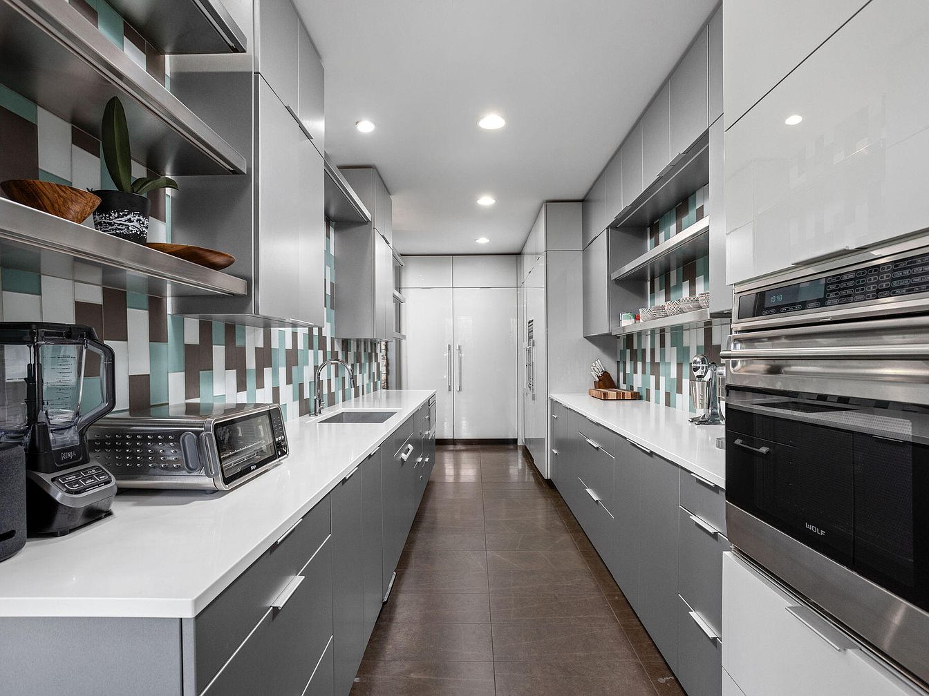 This narrow galley kitchen features a sleek, modern design with clean lines and a highly functional layout. Opposing walls are lined with matte gray cabinetry topped with polished white countertops, providing ample storage and workspace. The backsplash showcases a geometric pattern of white, teal, and taupe tiles, injecting visual interest and subtle color contrast. Stainless steel appliances, including built-in ovens and a blender, complement the contemporary look. Open shelves hold minimalist decor like wooden bowls and plants, adding warmth. Recessed ceiling lights brighten the space evenly, while large double doors at the end hint at a pantry or utility area.