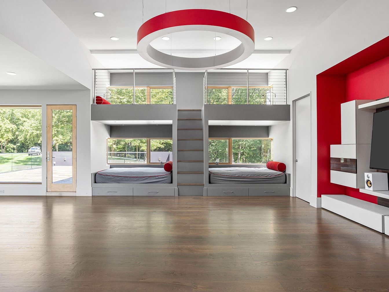 This open and airy space features custom-built bunk beds designed into a sleek, modern wall unit. The beds are stacked with two lower and two upper sleeping areas, separated by a central staircase with wooden steps and a minimalist metal railing. Large windows behind each bed frame flood the area with natural light and offer peaceful views of greenery outside. The room’s neutral palette is accented by vibrant red details, including bolsters on each bed and a prominent circular ceiling light fixture. Smooth hardwood floors and a built-in entertainment center with white and wood tones complete the aesthetic, blending functionality with contemporary style.